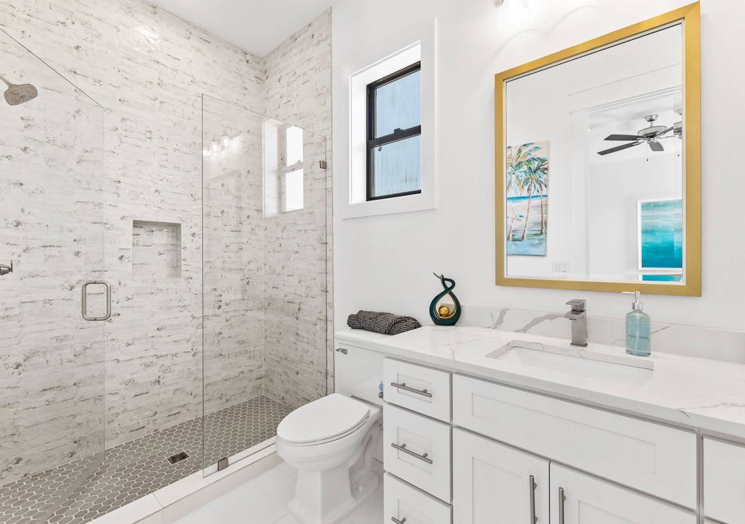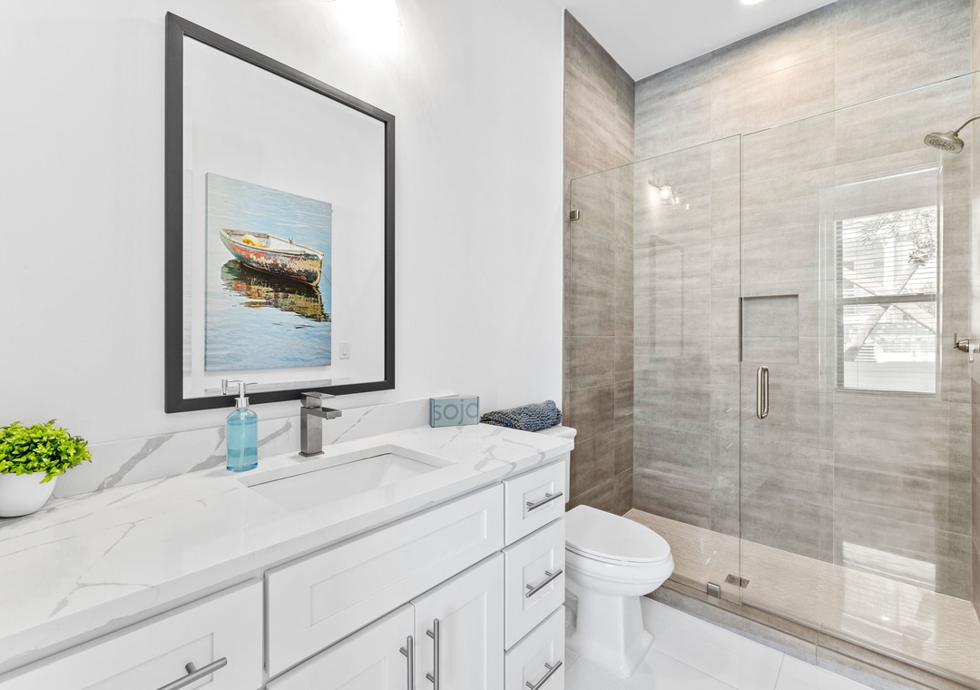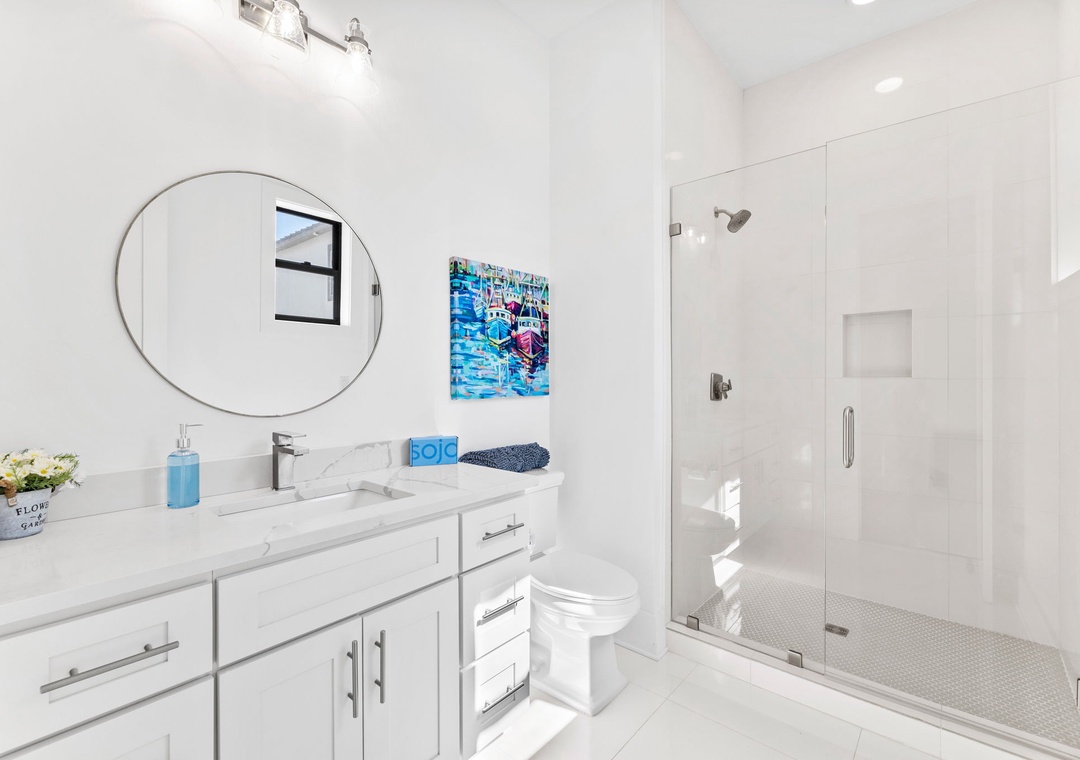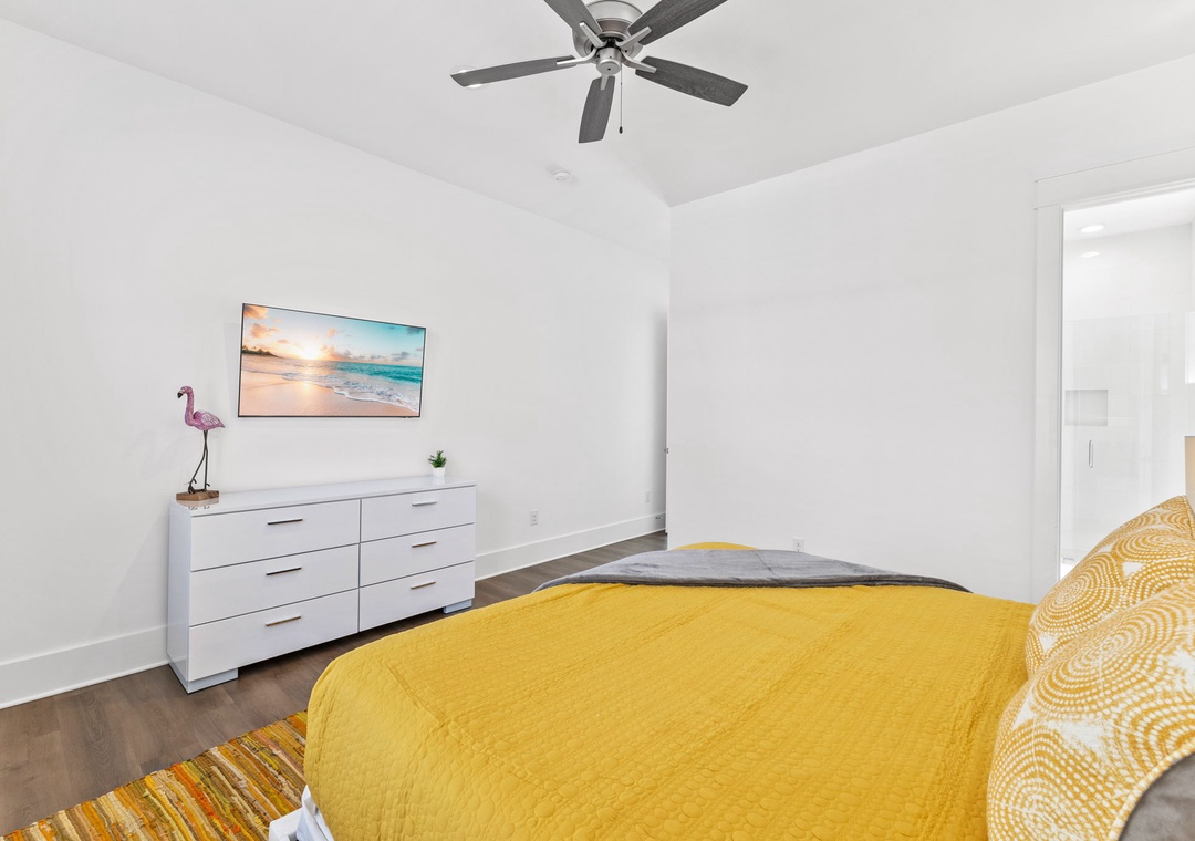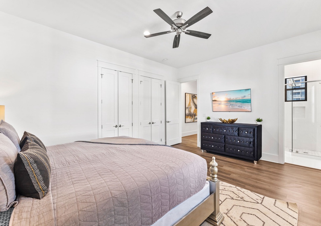 BEDROOM #4 + BATHROOM #4: It includes a king-sized bed, dresser, 2 nightstands, and a mounted flat-screen TV. It also has its own private bathroom with a glassed-in stand-up shower.