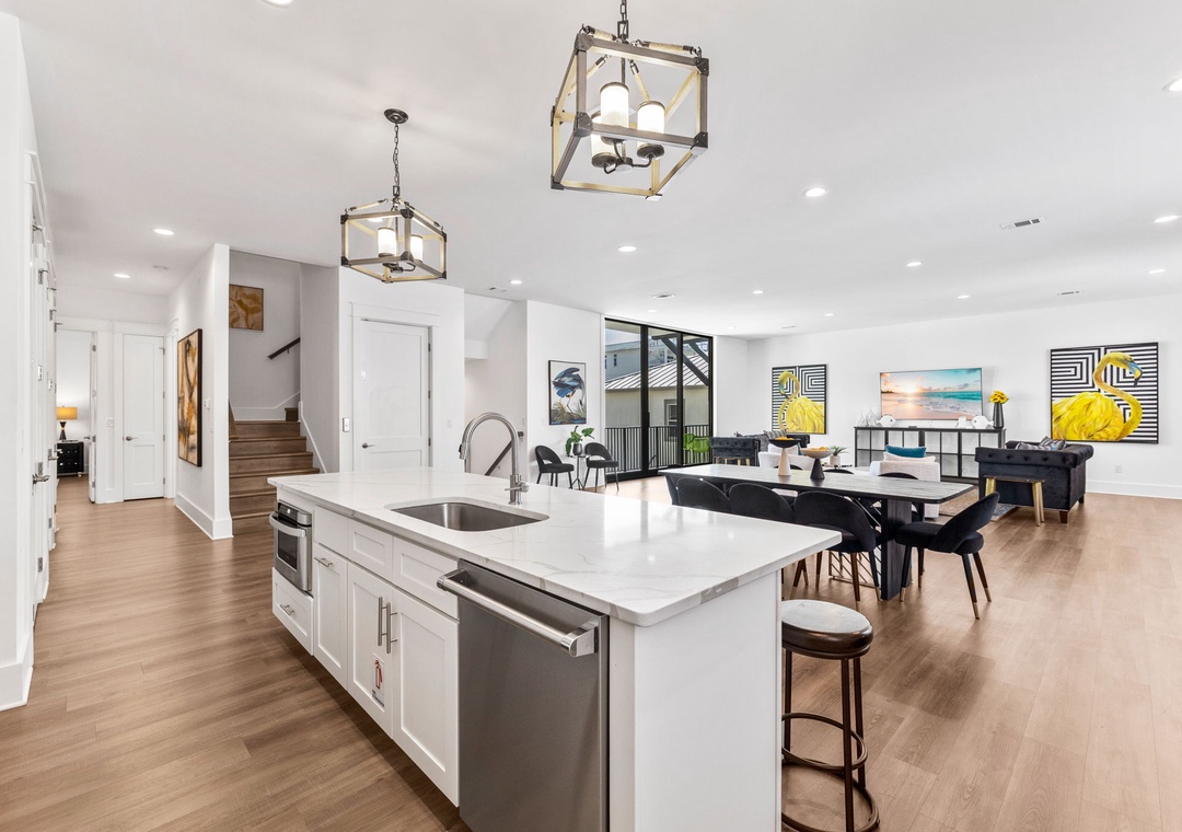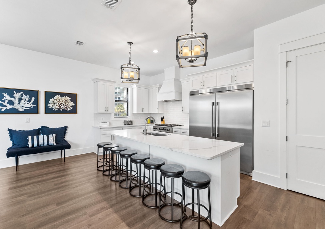 KITCHEN: This large kitchen is fully stocked for making meals with large families. It features high-end appliances and finishes throughout. Included are a microwave, dishwasher, stove, 1 refrigerator, 2 toasters, Keurig, coffeepot, crock-pot, griddle, and blender, as well as all the normal utensils and cookware. There is also a large island bar with seating for 8.