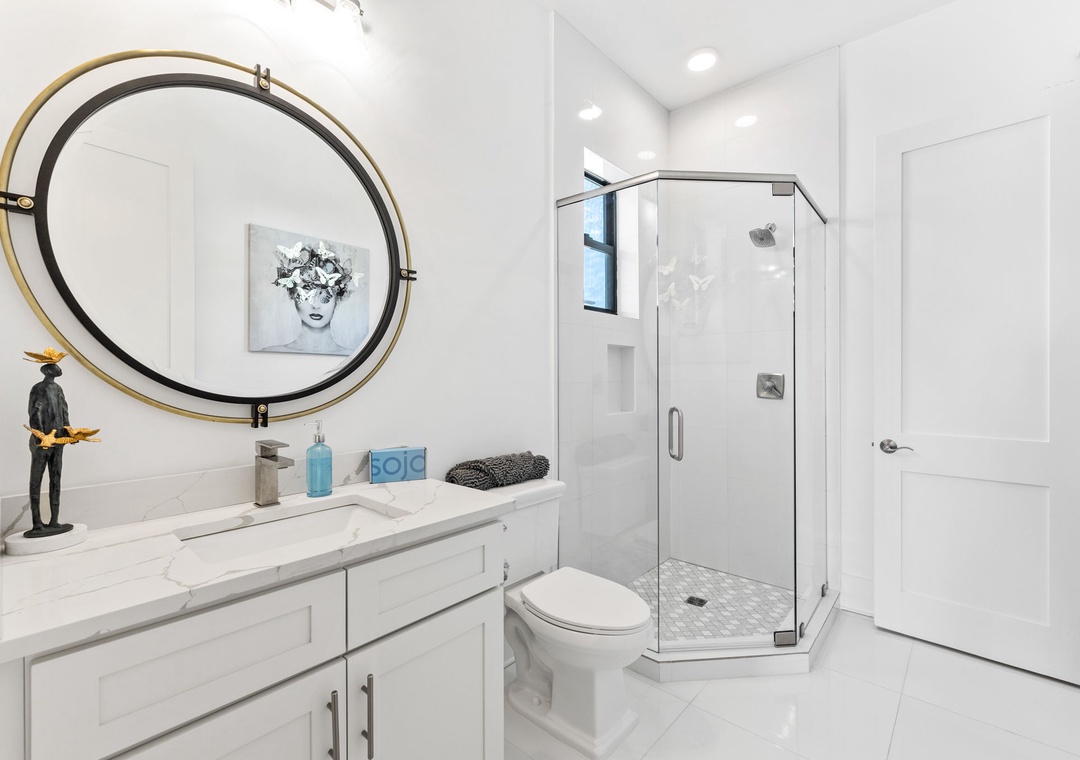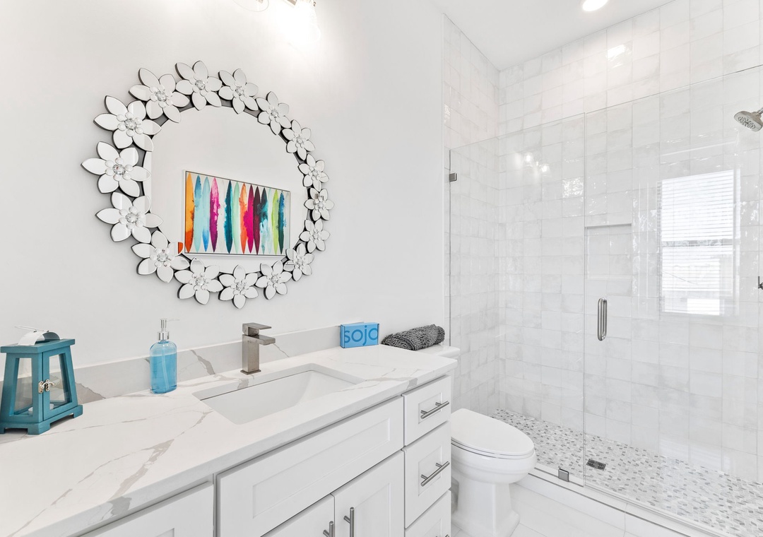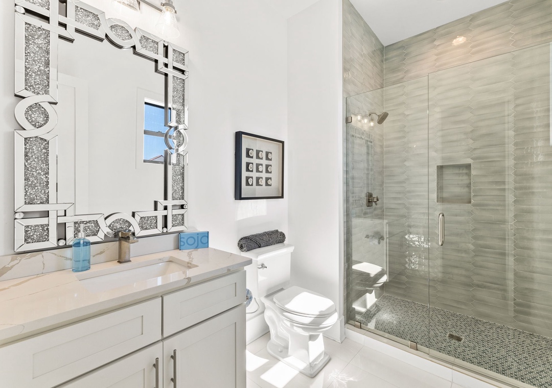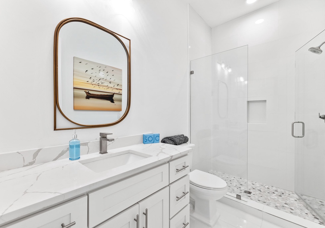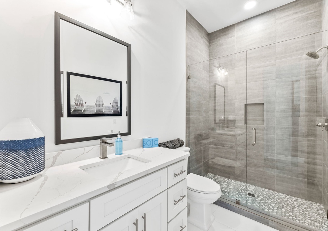 BEDROOM #5 + BATHROOM #5: It includes a king-sized bed, dresser, 2 nightstands, and a mounted flat-screen TV. It also has its own private bathroom with a glassed-in stand-up shower. This bathroom is also accessible from the hall.