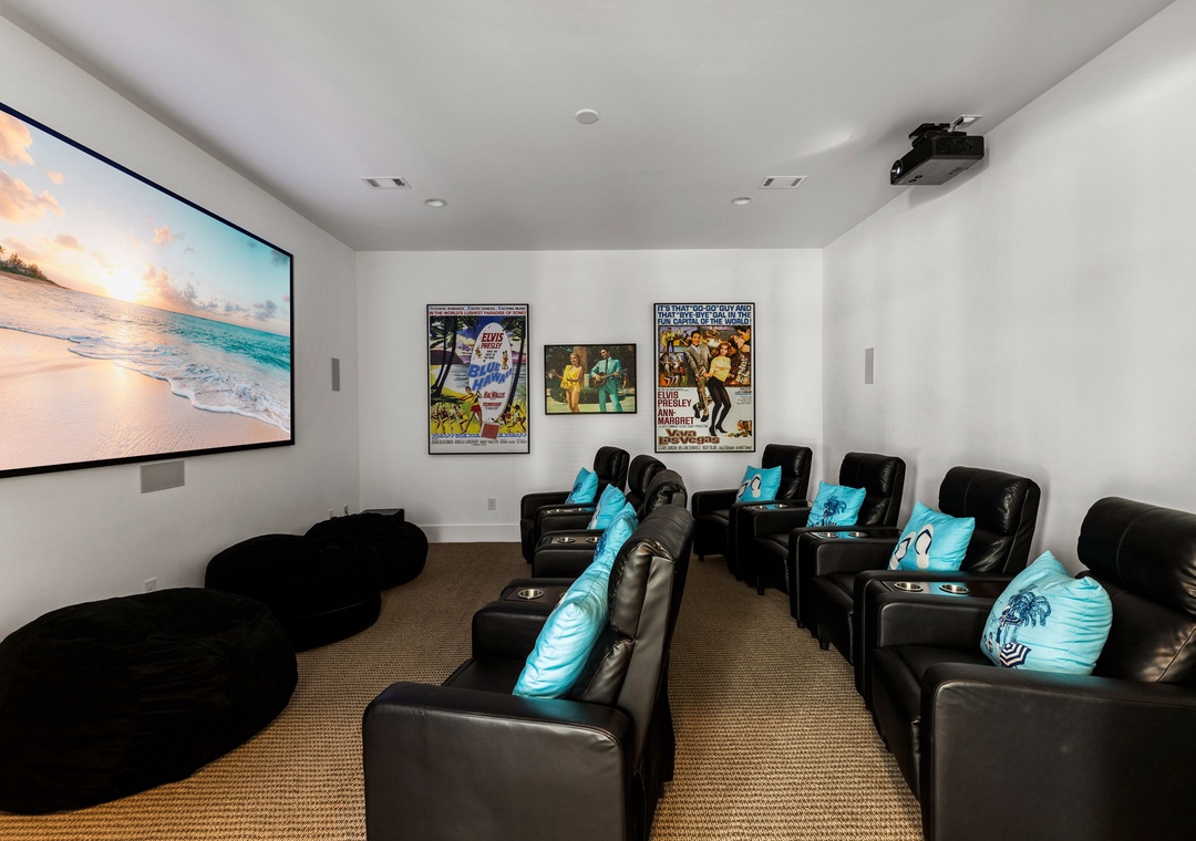 THEATER ROOM: This amazing space is perfect for watching movies or sports events. It includes a large TV, eight large recliners, and three bean bags.