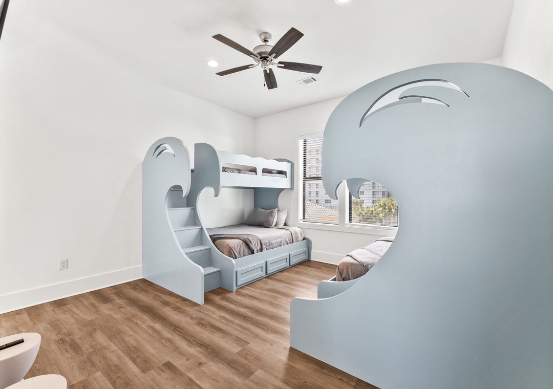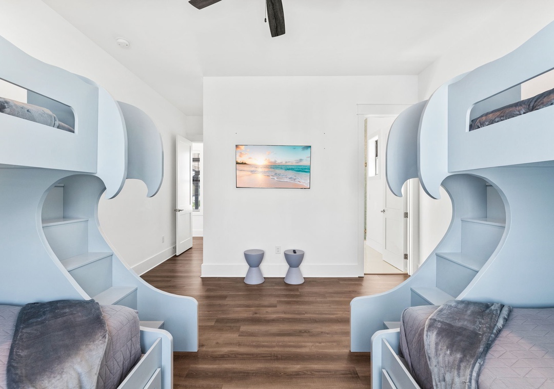 BEDROOM #9 + BATHROOM #9 (BUNK ROOM): This bedroom includes 2 twin/full bunk beds and a mounted flat-screen TV. It has its own private bathroom with a glassed-in shower.