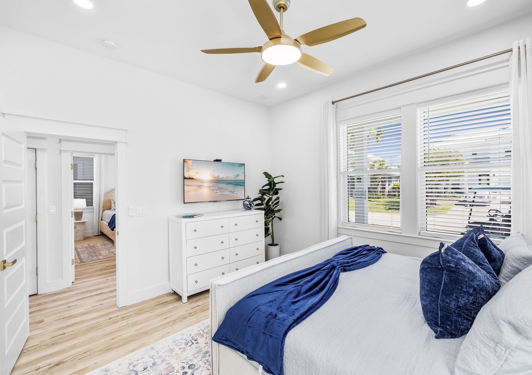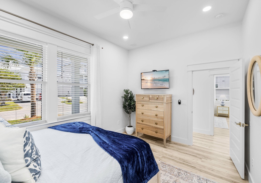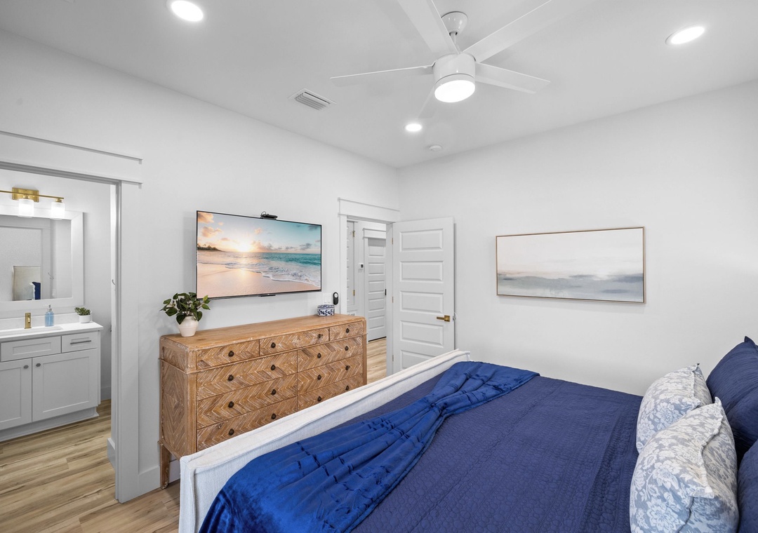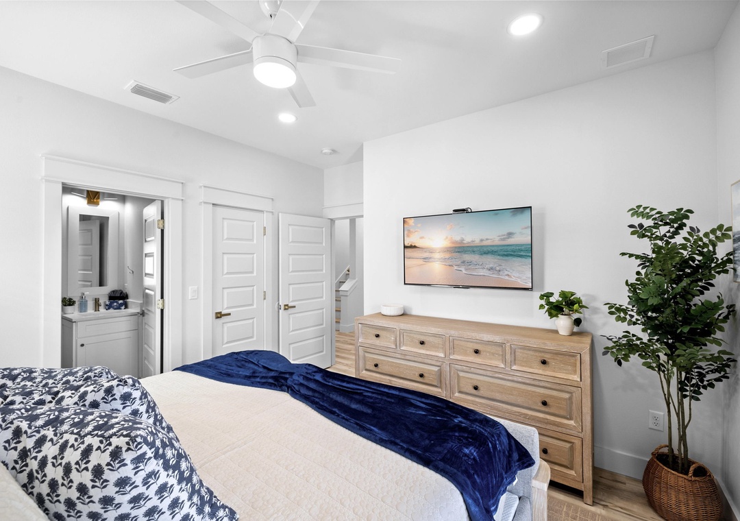 Bedroom + Bathroom #6: This bedroom is across from Bedroom #3, in the front left corner of the home. It includes a king-size bed, dresser, 2 nightstands, and a mounted flat-screen TV. It has its own private bathroom with a glassed-in stand-up shower, and also has access to the front balcony.