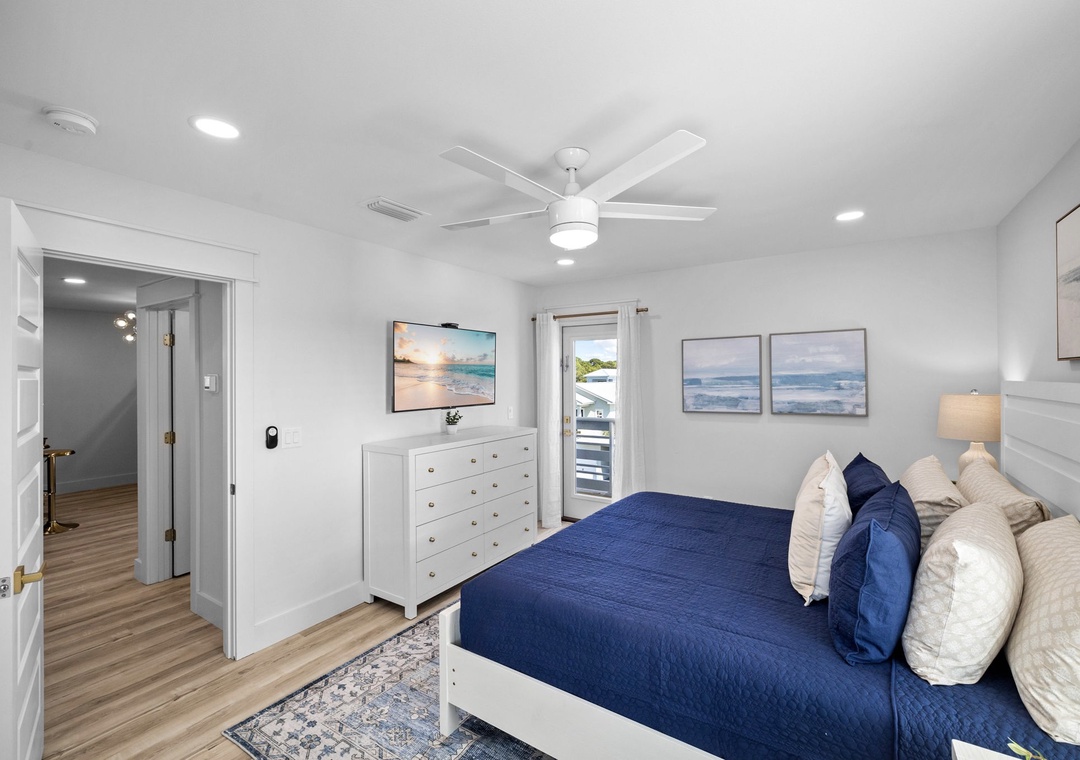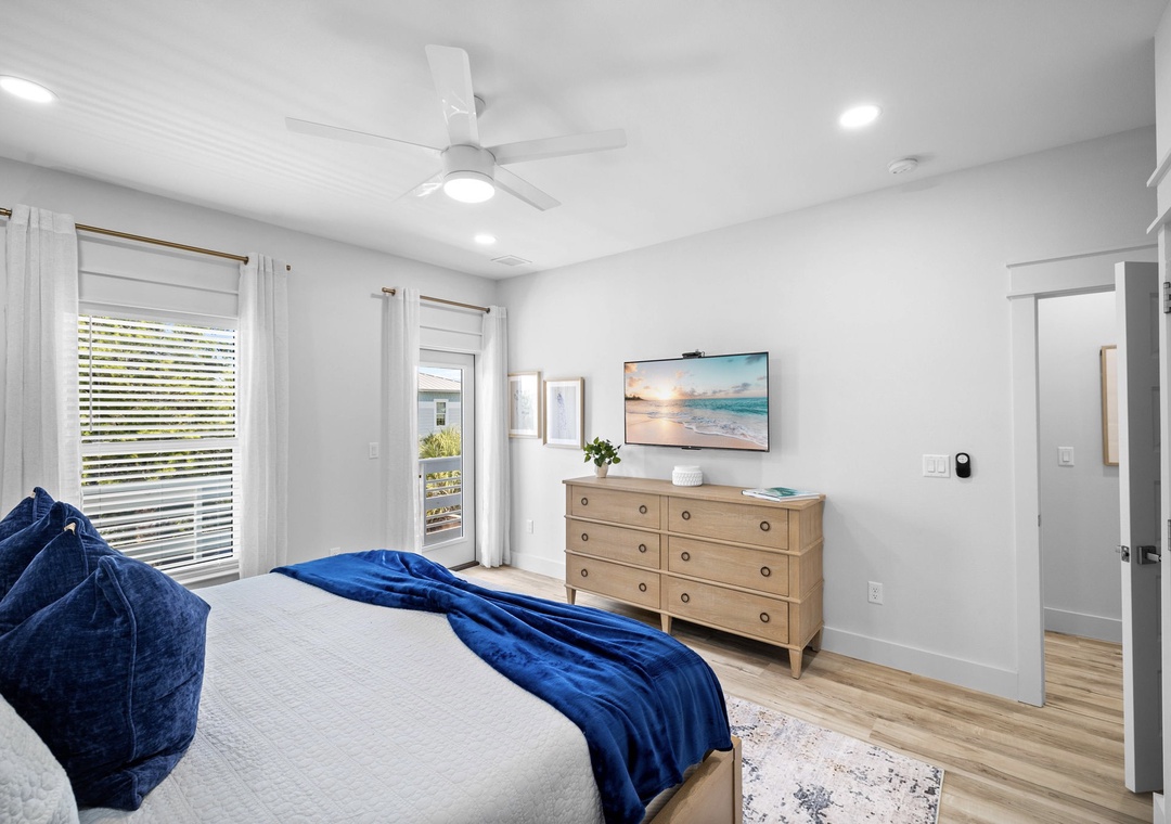 King bed with a mounted flat-screen TV and access to the front balcony