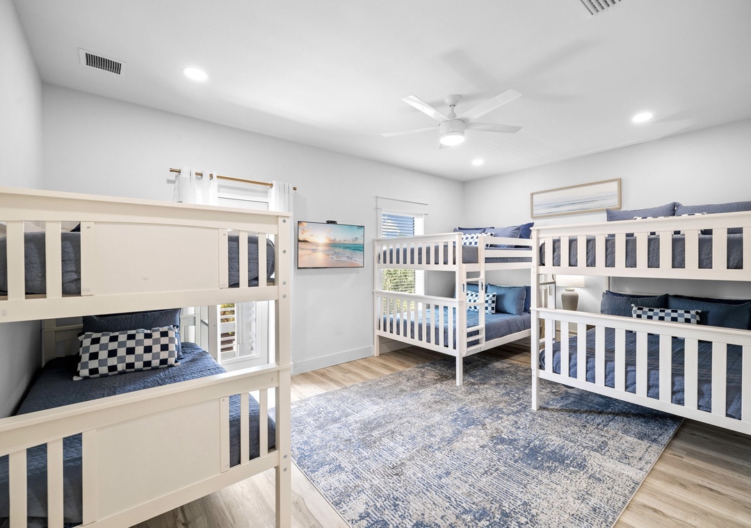 Bedroom (Bunk Room) + Bathroom #3: When you get to the landing on the 2nd floor, go right to find Bedroom #5. This is the bunk room including 2 full-over-full bunks beds, 1 twin-over-twin bunk bed, 1 nightstand, and a mounted flat-screen TV. It has its own private bathroom with 2 sinks and a glassed-in shower. There is extra floor space for an air mattress. This room also has access to the backyard balcony that runs the full length of the back of the home. There is a coded security lock on this balcony door for child safety.