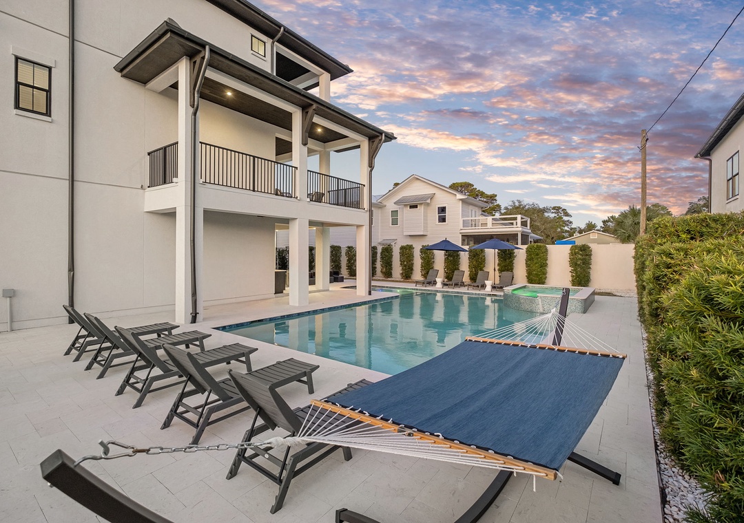 BACKYARD: This resort-style backyard exudes luxury and style with its gorgeous private pool and attached spa! There are plenty of loungers, a dining set, and a gas grill. The pool/spa can also be heated in the cooler months.