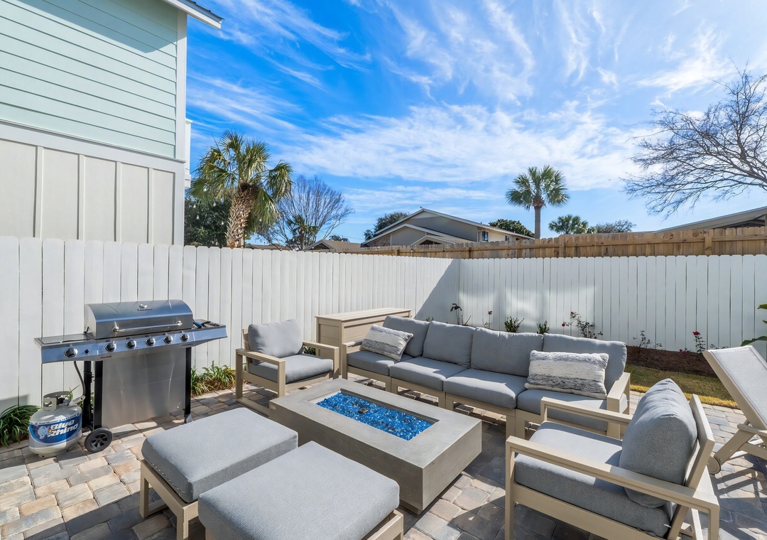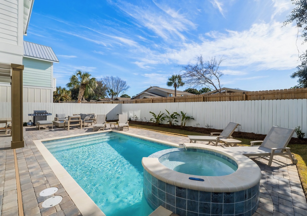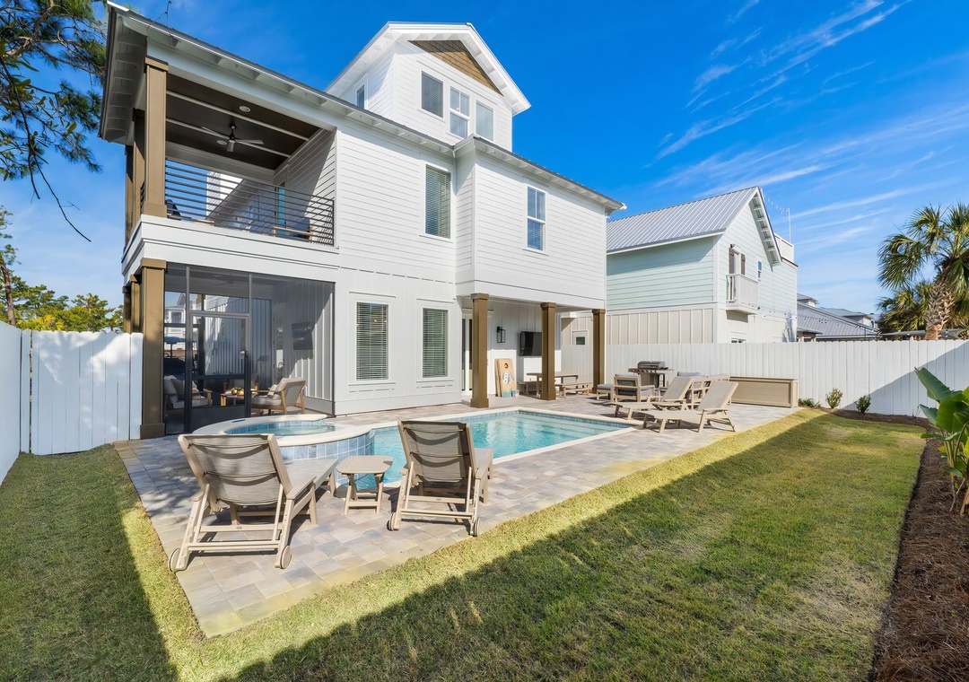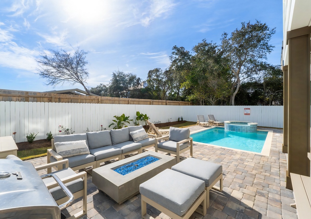 Backyard: The fenced backyard features a private pool and cascading spa, surrounded by comfortable loungers for soaking up the sun. A screened-in patio provides shaded seating with an outdoor TV, while the open patio area includes a gas grill, dining table, firepit, and cornhole setup. An outdoor shower is also available for rinsing off after the beach, making this space ideal for relaxing, entertaining, and enjoying the Florida sunshine.
