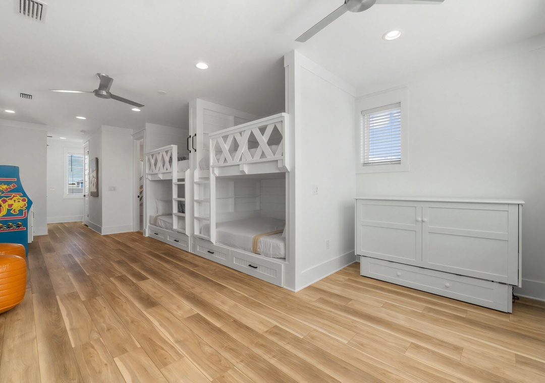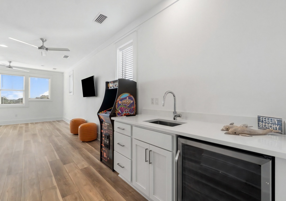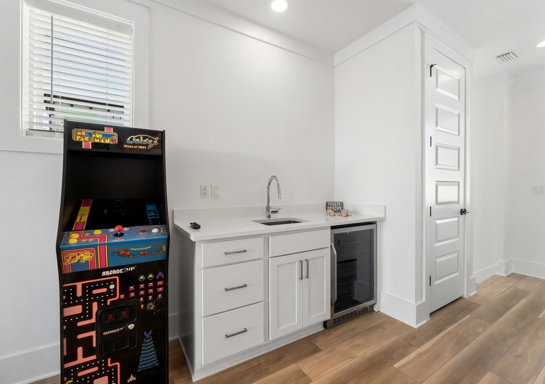 Game Area + Wet Bar: The 3rd floor bunk room offers a dedicated game area with an arcade machine and a convenient wet bar complete with a wine cooler and sink.