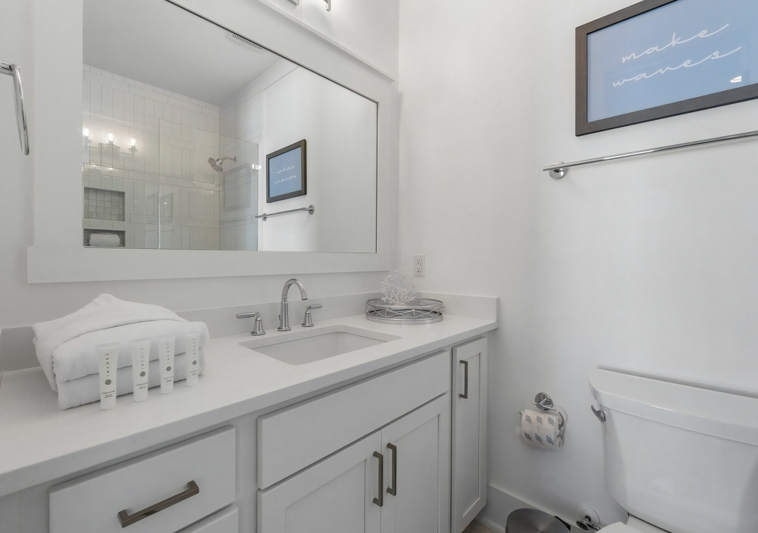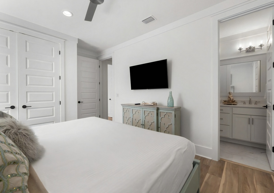 Bedroom + Bathroom #1: This bedroom includes a king-sized bed, 2 nightstands, a dresser, private closet, and flat-screen TV. There is a private bathroom attached with a Jack-and-Jill vanity and large walk-in shower.