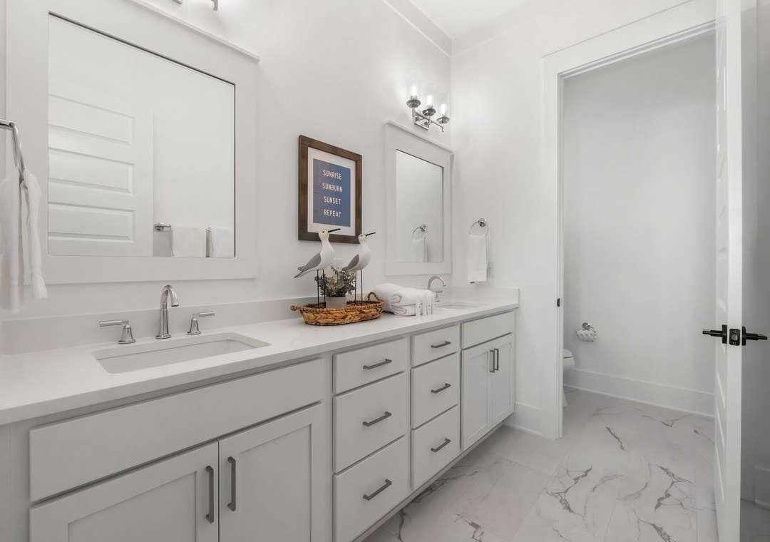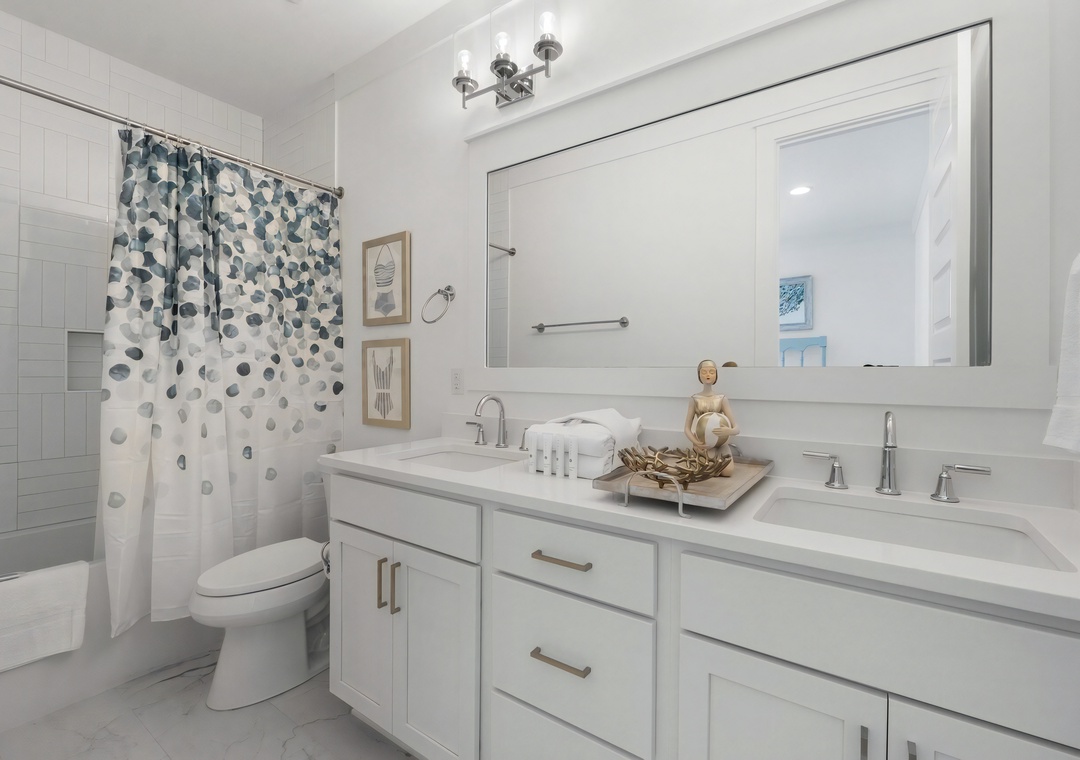 Bedroom + Bathroom #3: This bedroom includes a king-sized bed, 2 nightstands, a dresser, private closet, and flat-screen TV. There is a private bathroom attached with a Jack-and-Jill vanity and shower/bathtub combination.