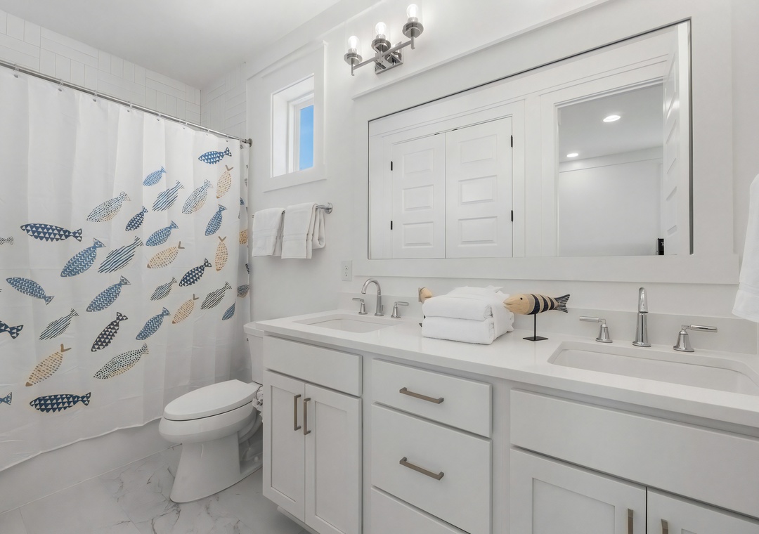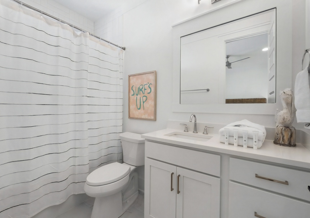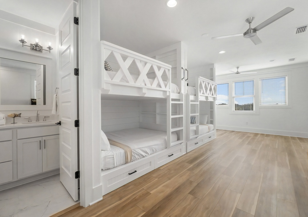 Bedroom + Bathroom #6: This bedroom includes 2 custom-built queen/queen bunks, 2 beanbags, a dresser, and flat-screen TV. There is a private bathroom attached with a Jack-and-Jill vanity and shower/bathtub combination.