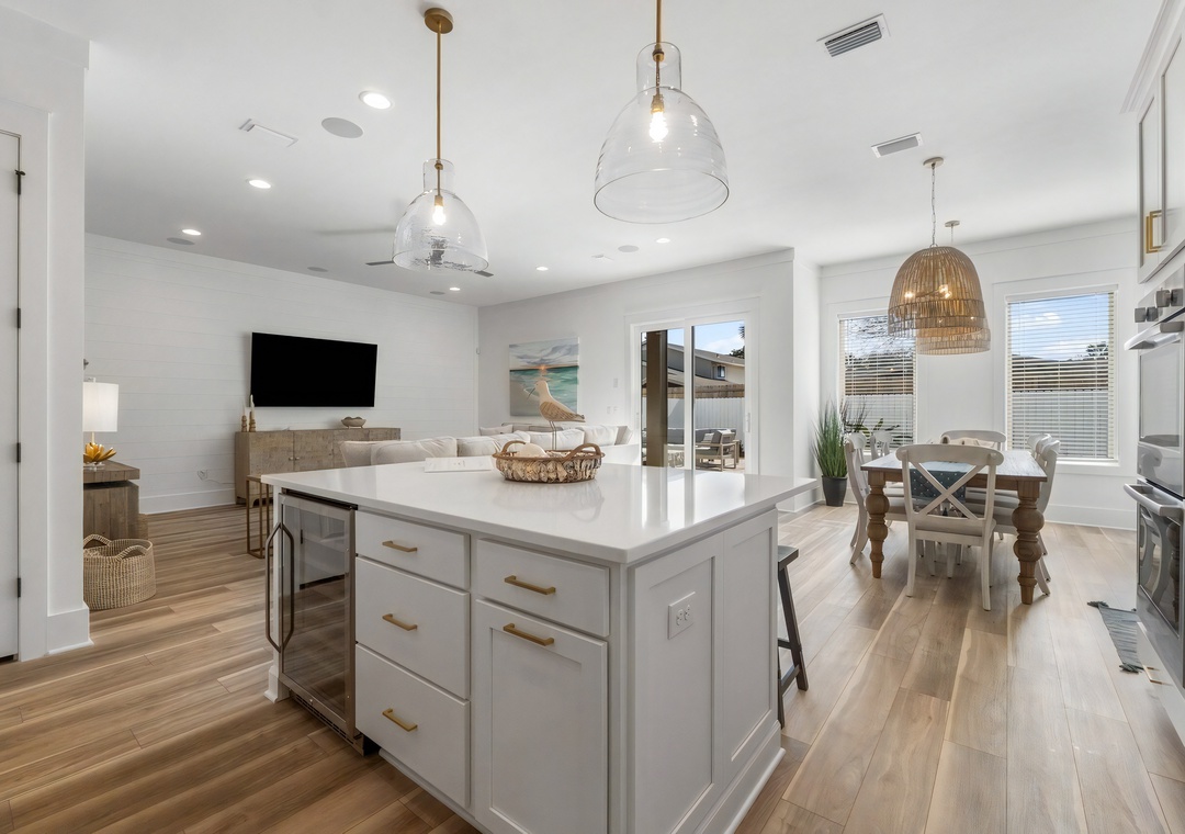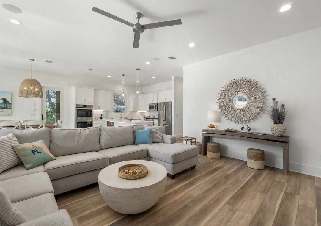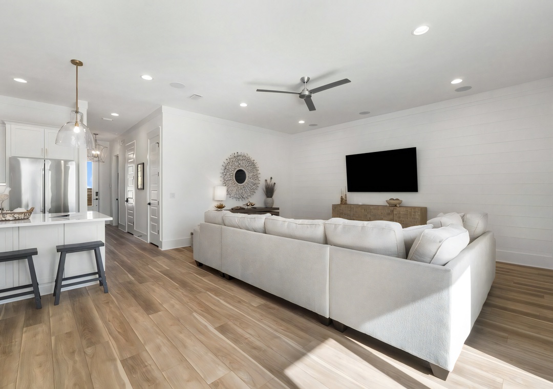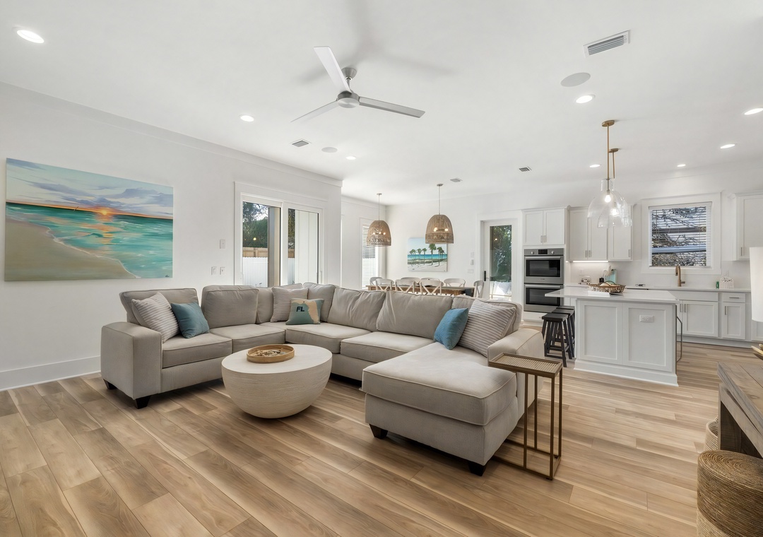 Living Room: The bright and spacious living room features a large sectional sofa, a mounted flat-screen TV, and easy access to the screened-in patio and backyard pool area. Coastal accents and decor create an inviting space for relaxing and spending time together.
