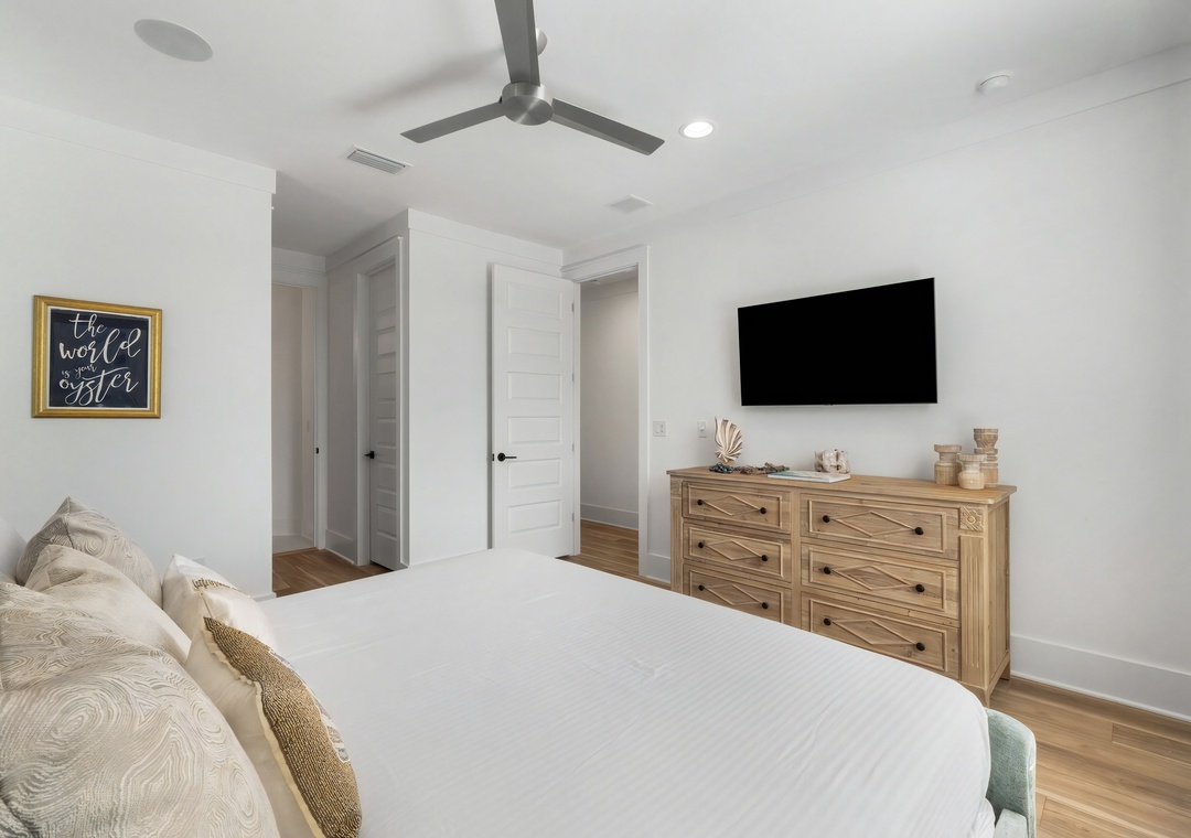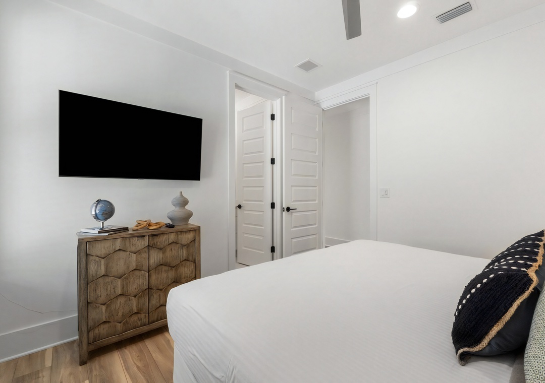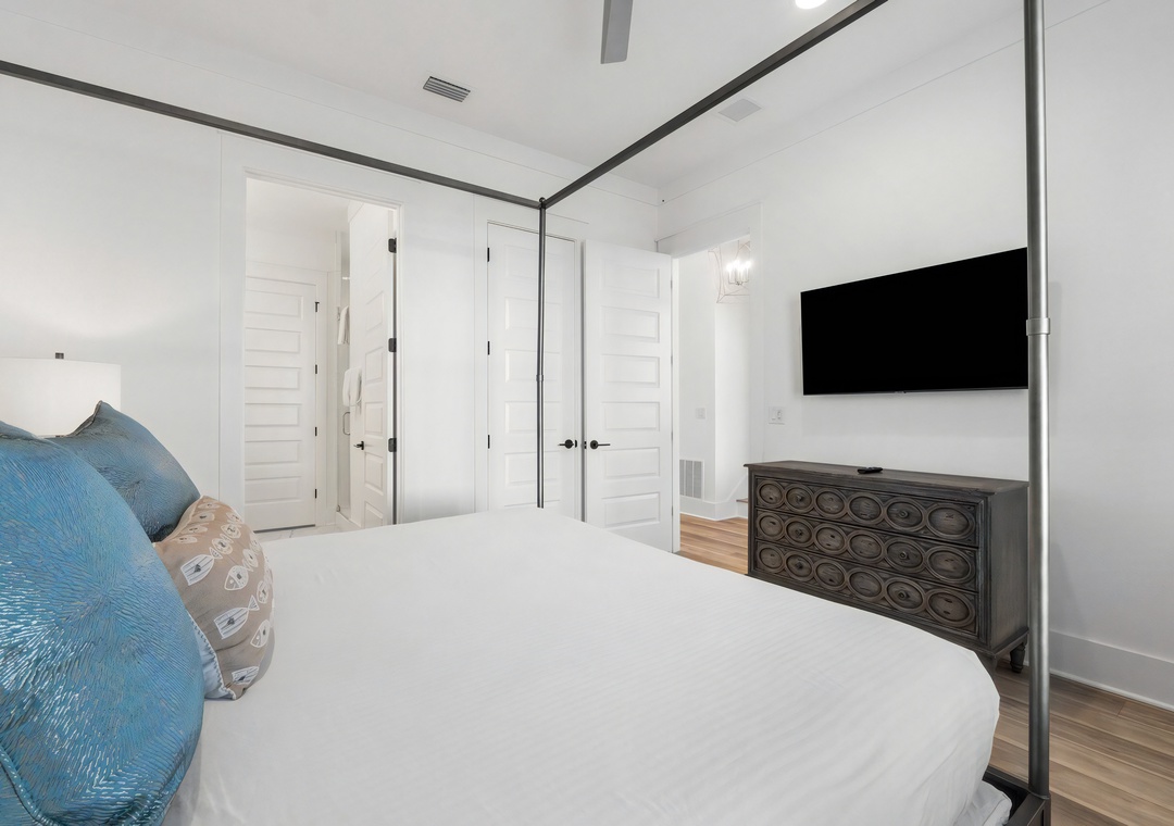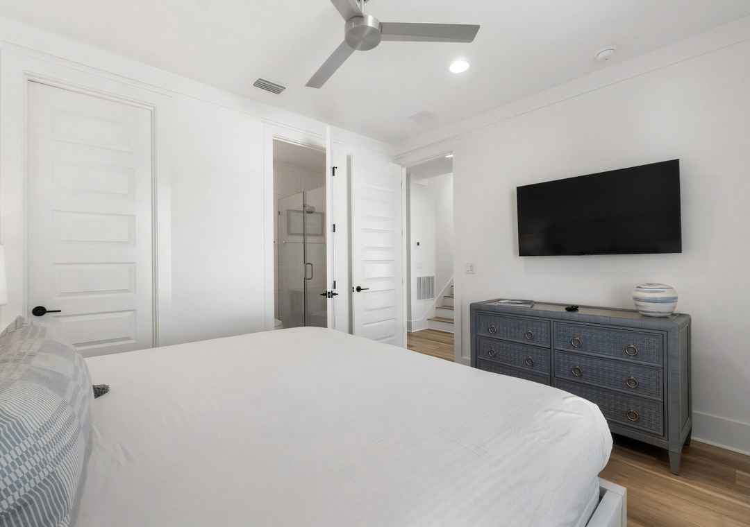 Bedroom + Bathroom #4: This bedroom includes a king-sized bed, 2 nightstands, a dresser, private closet, and flat-screen TV. There is a private bathroom attached with a single vanity and large walk-in shower.