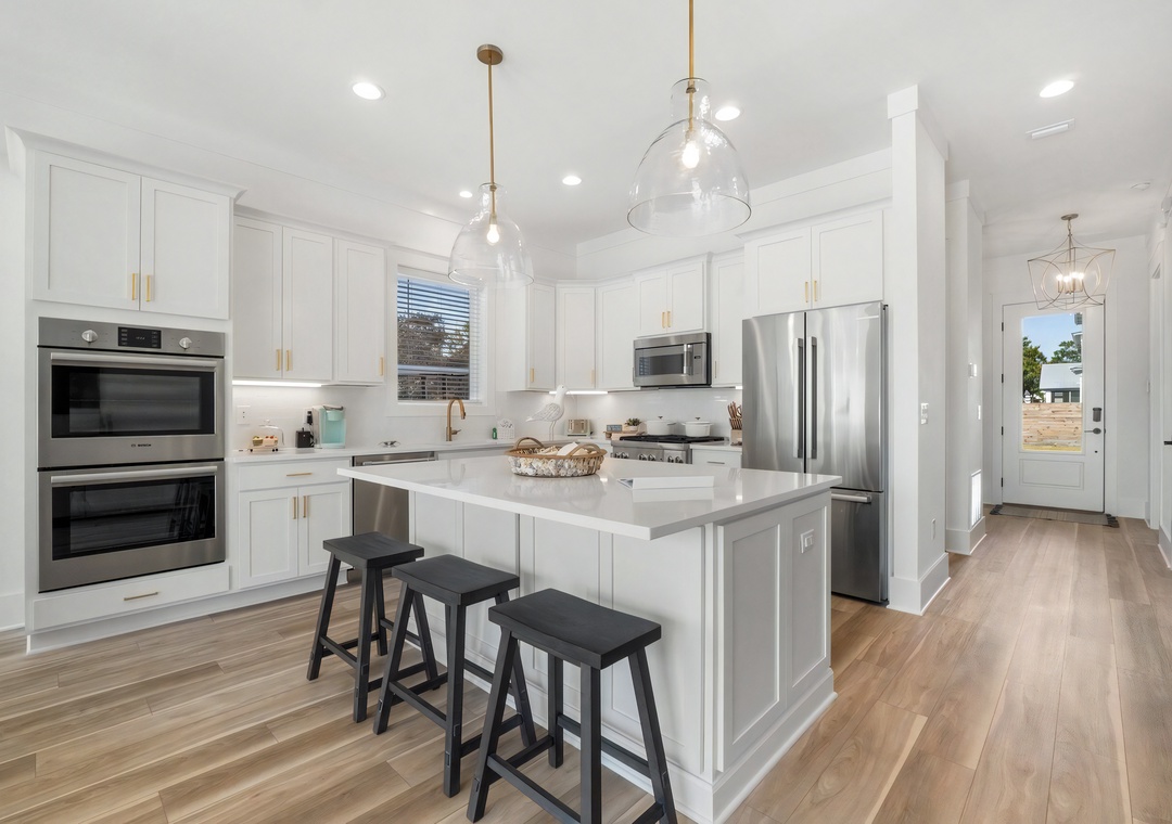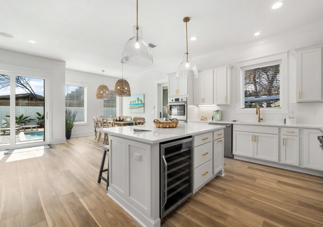 Kitchen: The gourmet kitchen is fully equipped for preparing meals with family and friends. It features sleek cabinetry, high-end appliances, and a spacious walk-in pantry. Amenities include 3 ovens, a refrigerator, microwave, dishwasher, wine fridge, toaster, Keurig, coffeemaker, crockpot, griddle, and blender, along with all standard cookware and utensils. A large island with seating for 3 offers additional space for casual dining.