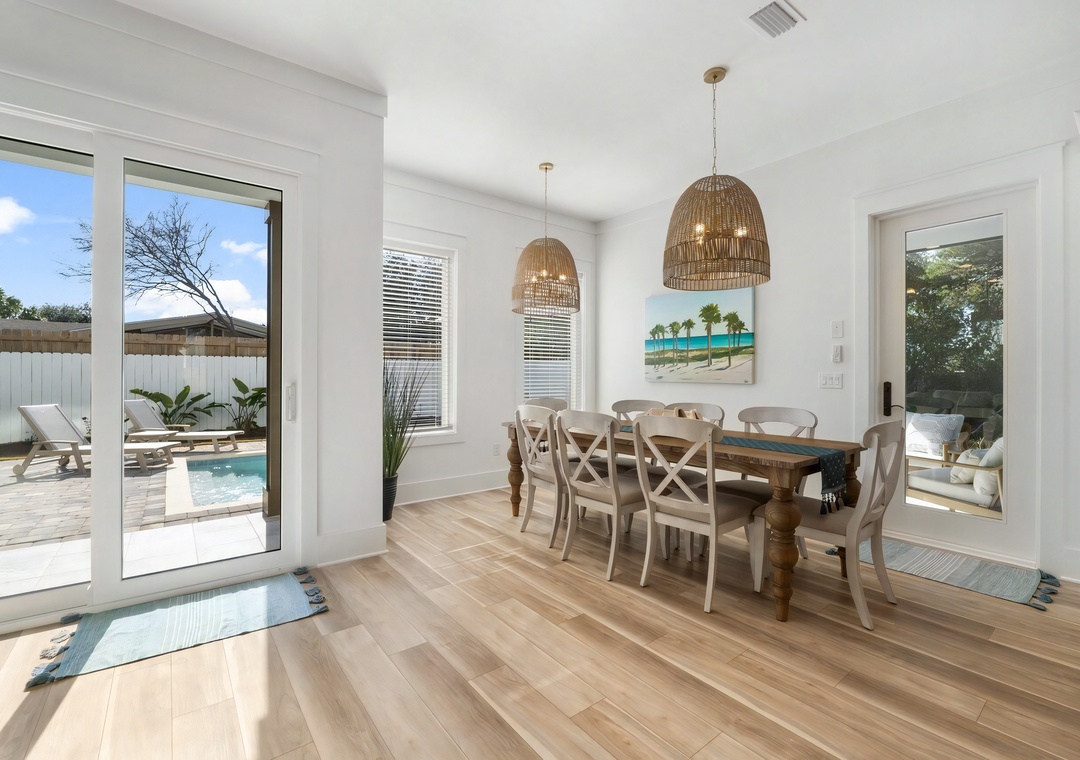 Dining Room: The dining area includes a wooden table with seating for 8, positioned near the kitchen for easy serving and designed to accommodate large groups comfortably.
