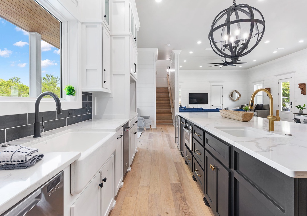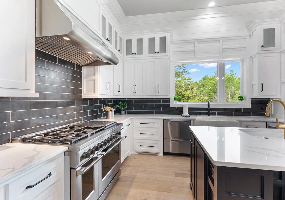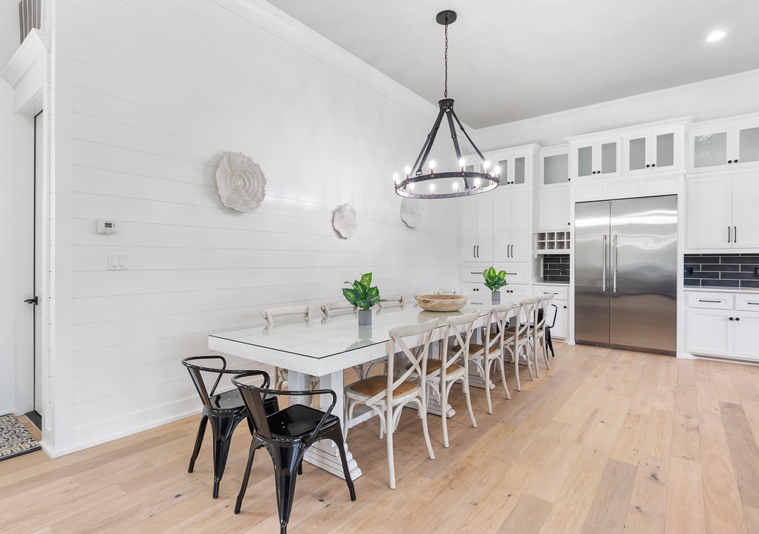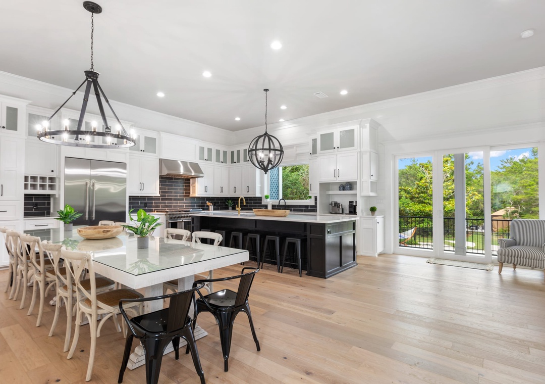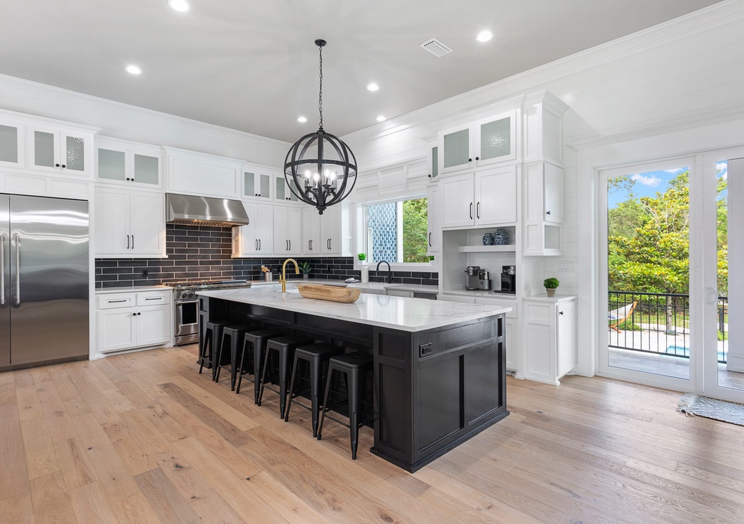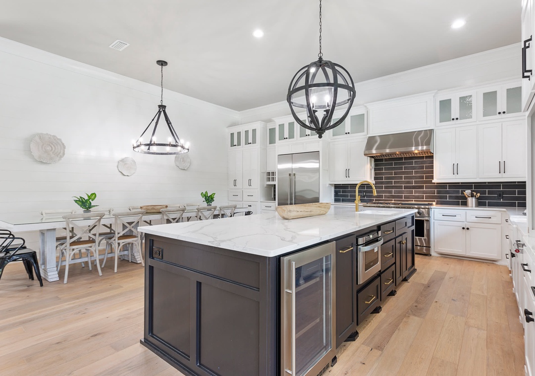 KITCHEN: This incredibly large kitchen extends into the dining room and has everything you need to entertain your group with modern high-end appliances. It includes an extra large refrigerator, two prep sinks, double drawer dishwasher, a gas stove with griddle extension, two ovens, a separate ice maker, and all the cookware and utensils you will need. The beautiful oversized island has seating for six.