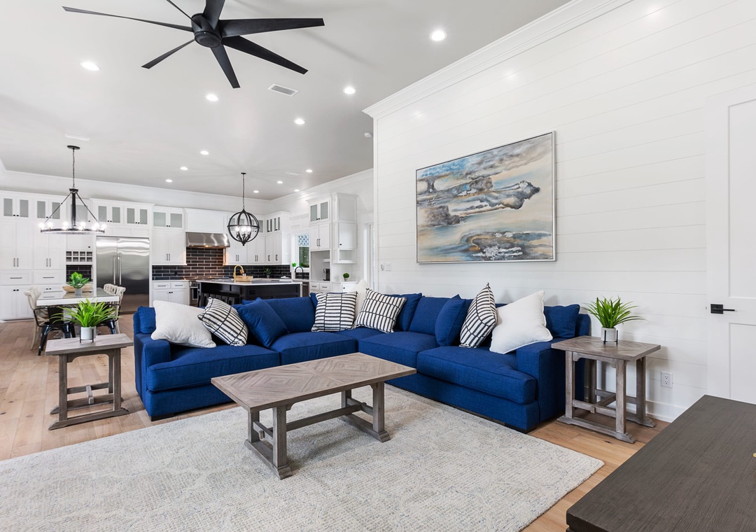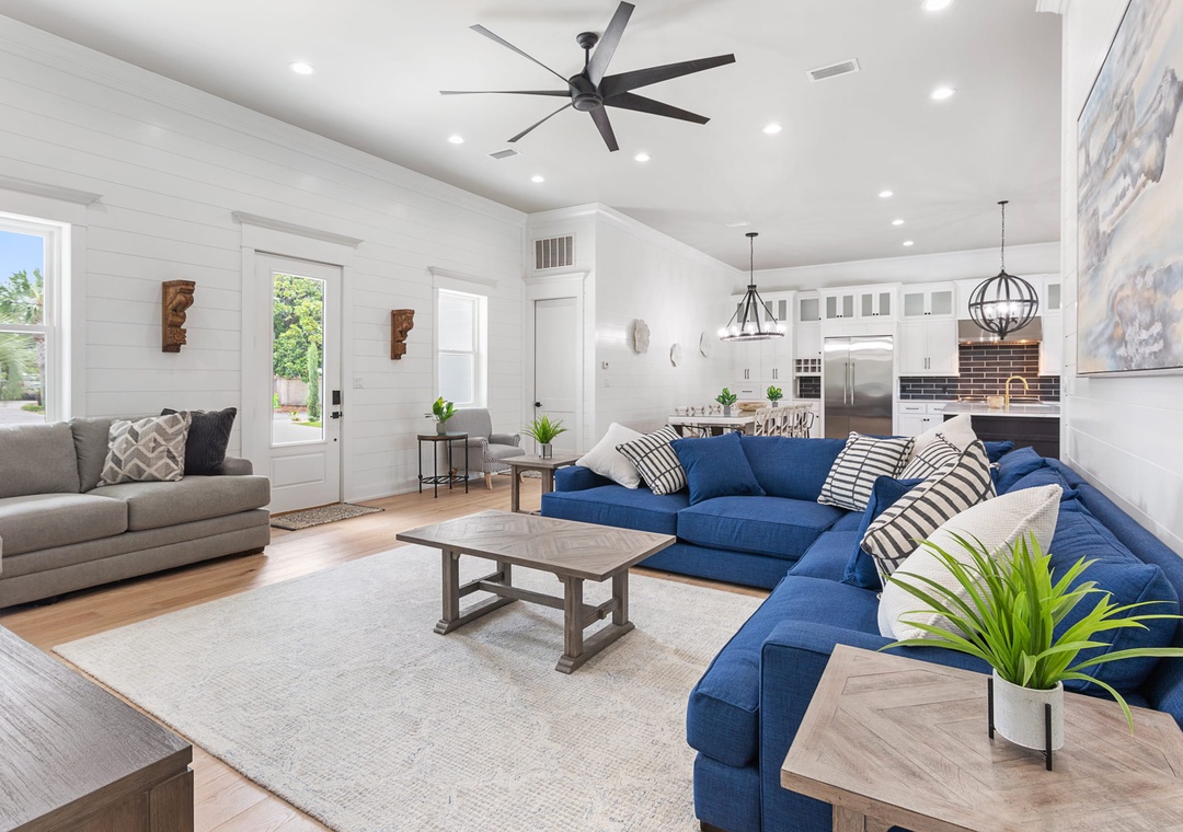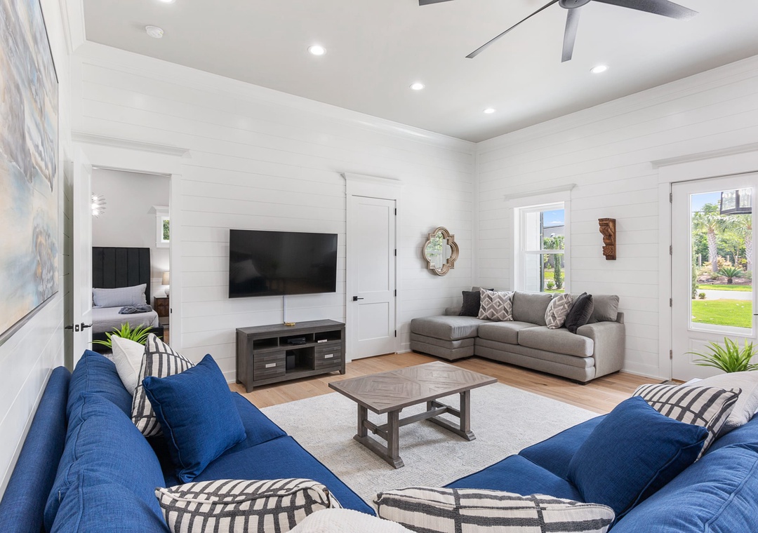 LIVING ROOM: The living room is on the right-hand side and has an extensive sectional, several other seating options, and a large flat-screen TV.