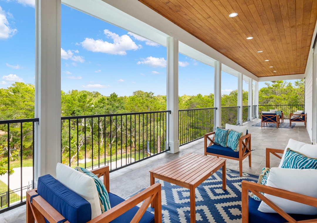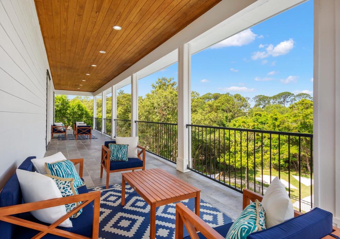 BALCONY: Located off the living space is a very large balcony that runs the length of the back of the home, overlooking the backyard space.
