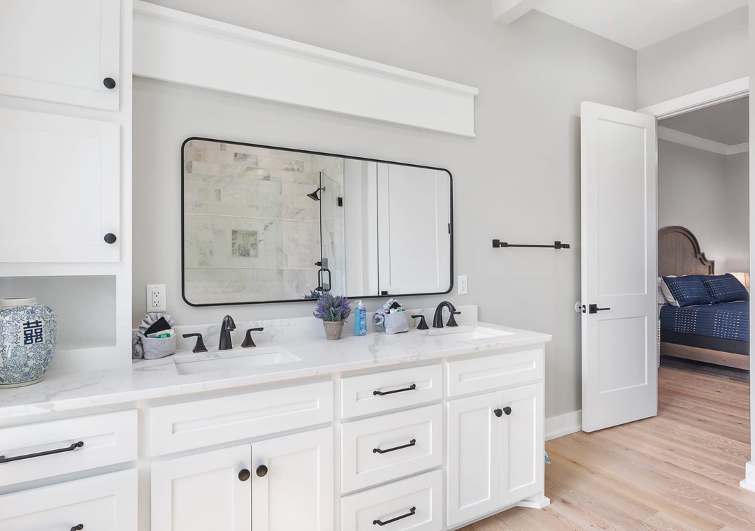 BEDROOM #8 + BATHROOM #6: Right next to bedroom #7, this bedroom includes a king-size bed, two nightstands, and a flat-screen TV. It also has a private bathroom with a single sink vanity and stand-up shower.
