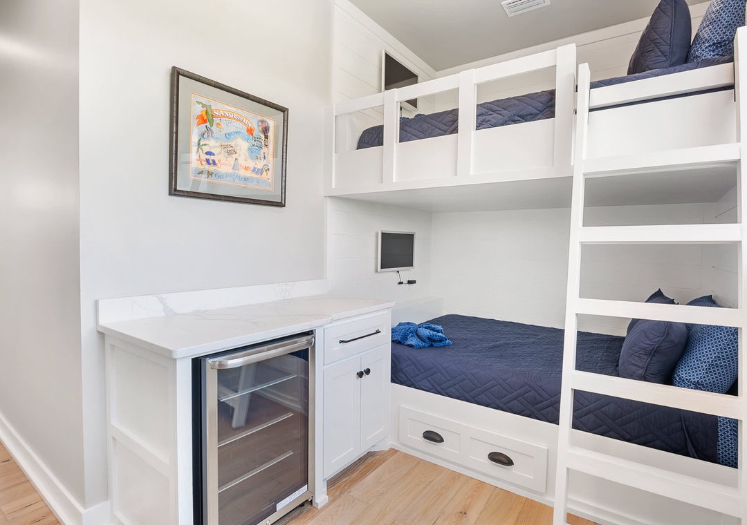 BEDROOM (BUNK ROOM) #6: Another bunk space is at the top of the stairs. It has a custom-built, full-over-full bunk bed and two flat screens, one in each bunk space. This space also has another small bar with another mini-fridge.