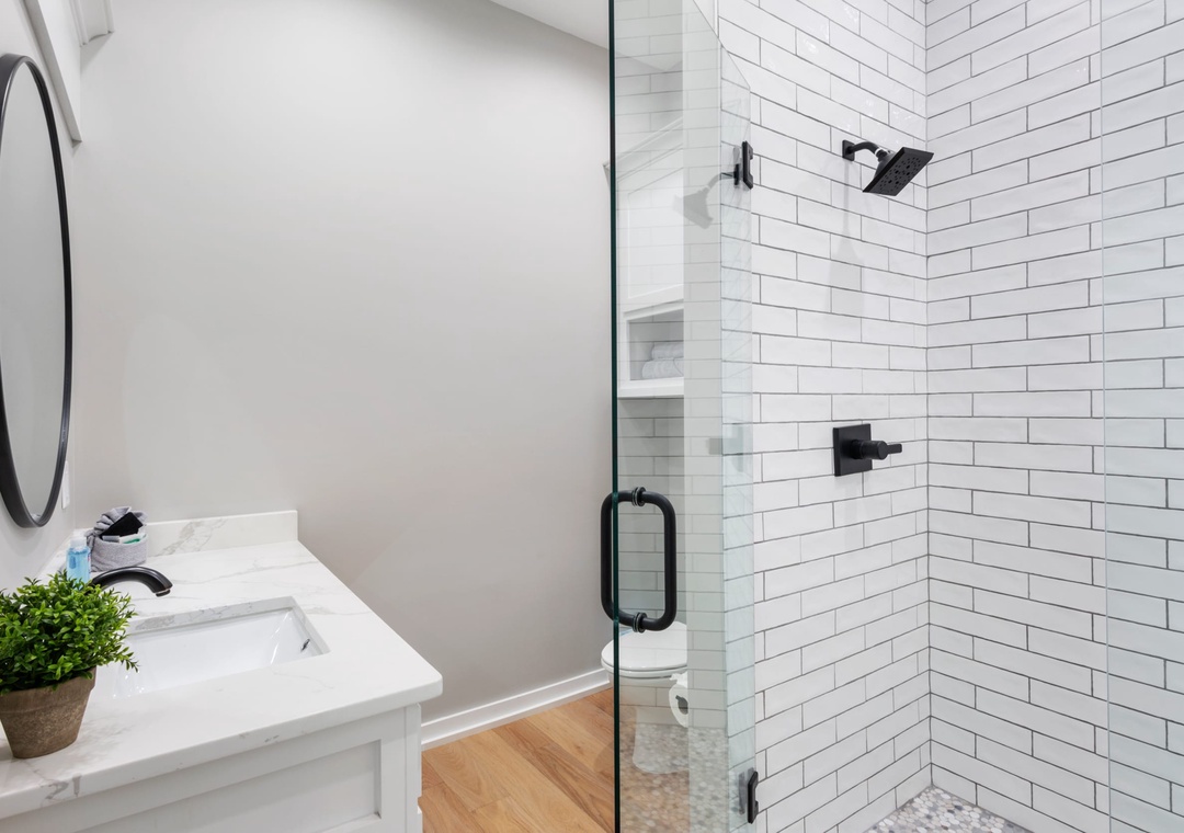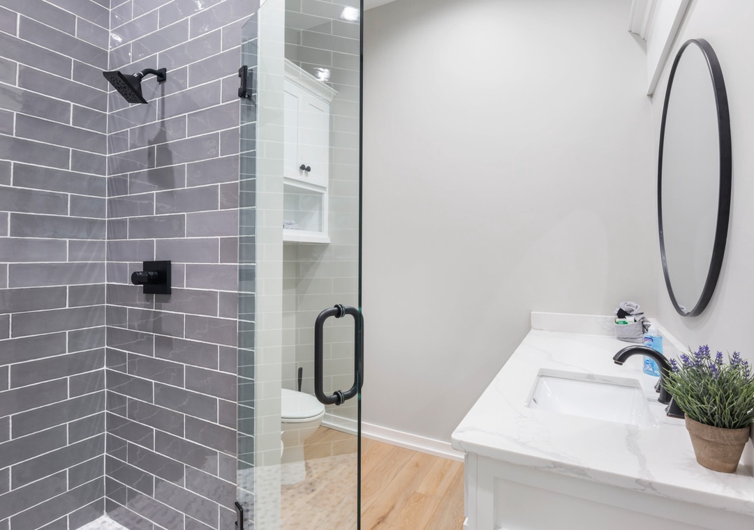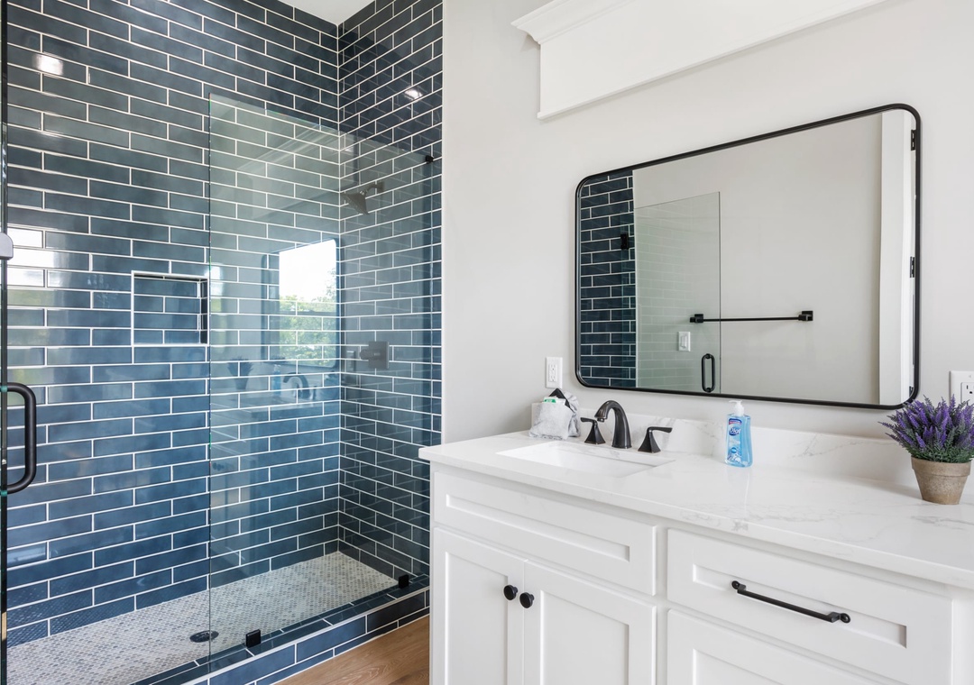 BEDROOM + BATHROOM #3: Walk through the living space to get to bedroom #3. It includes a king-size bed, two nightstands, and a flat-screen TV. It also has a private bathroom with a single sink vanity and stand-up shower.