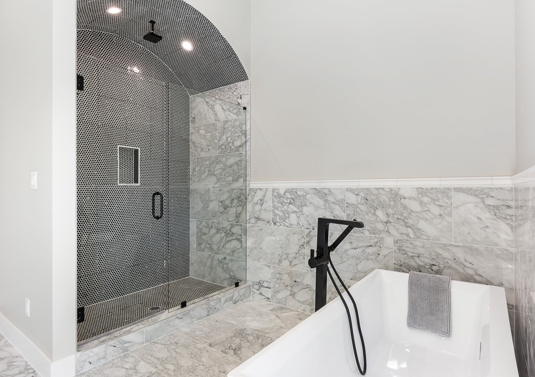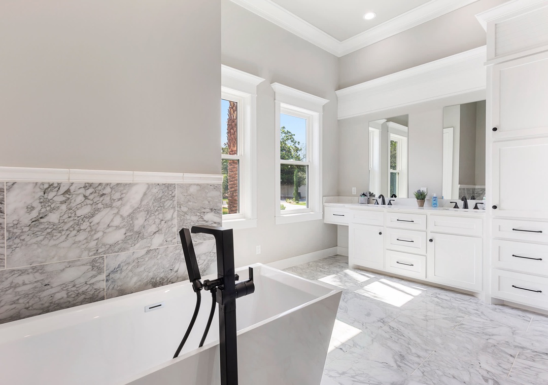 BEDROOM #1 + BATHROOM #1: This bedroom is located off the living room and has a king-size bed, 2 nightstands, and a flat-screen TV. It has a private bathroom that is quite large and stunning. It includes a double sink vanity, a stand-up shower with a rain head faucet, and a stand-alone bathtub.
