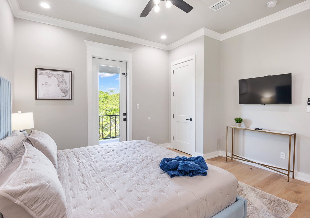 BEDROOM + BATHROOM #4: This bedroom is through the living space and to the far right. It includes a king-size bed, two nightstands, and a flat-screen TV. It also has a private bathroom with a double sink and stand-up shower. This bedroom also has access to the large balcony described above.