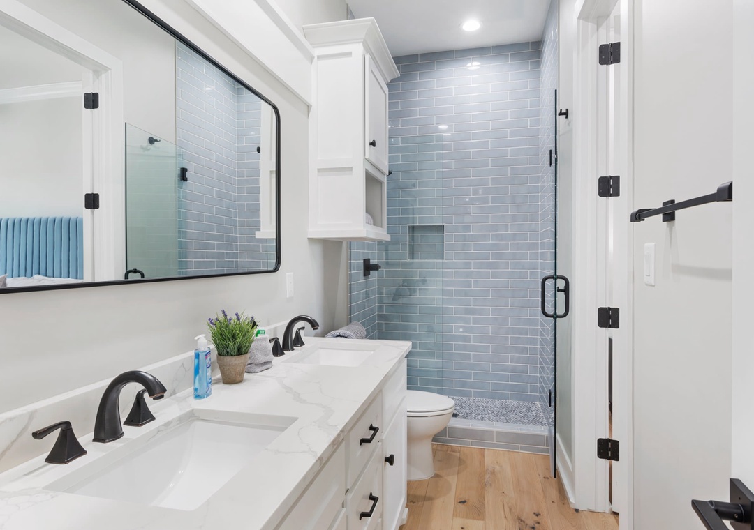 BEDROOM + BATHROOM #2: This bedroom is past the living space and to the right. It includes a king-size bed, two nightstands, and a flat-screen TV. It also has a private bathroom with a double sink and stand-up shower.