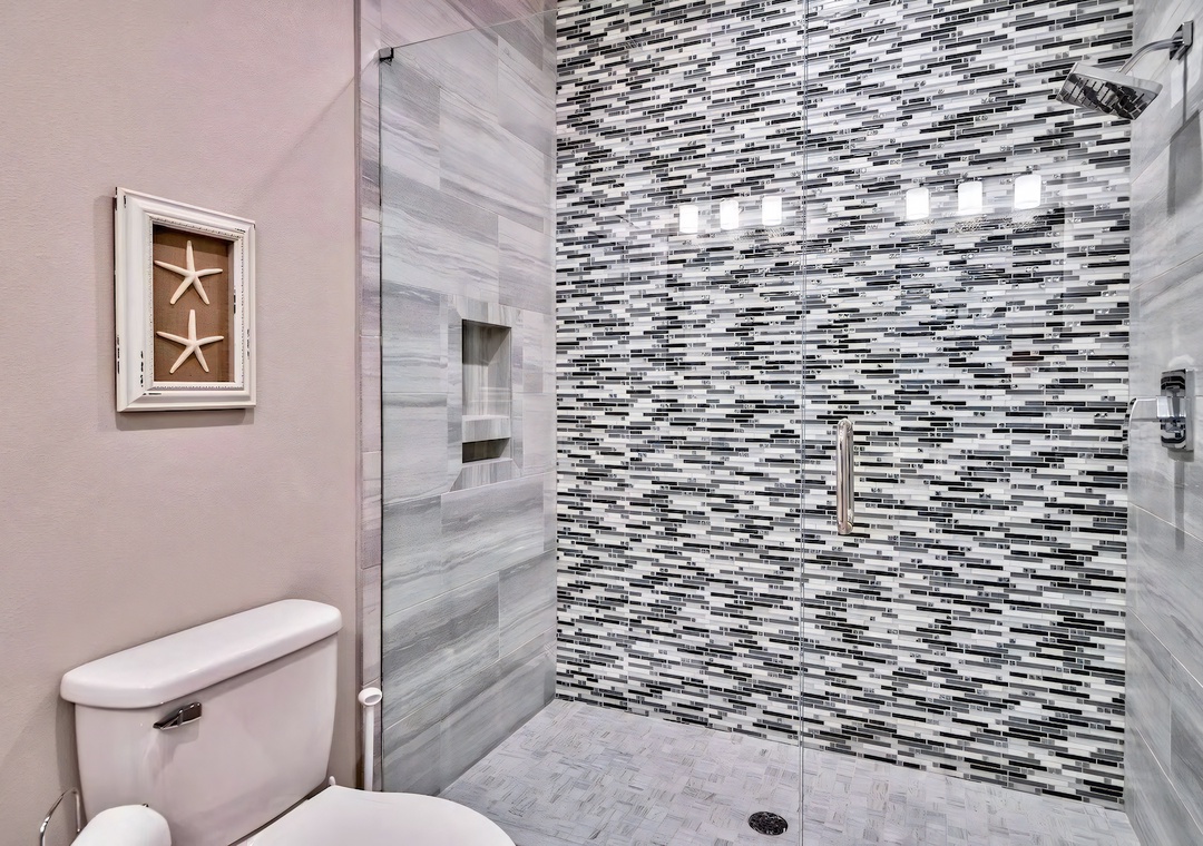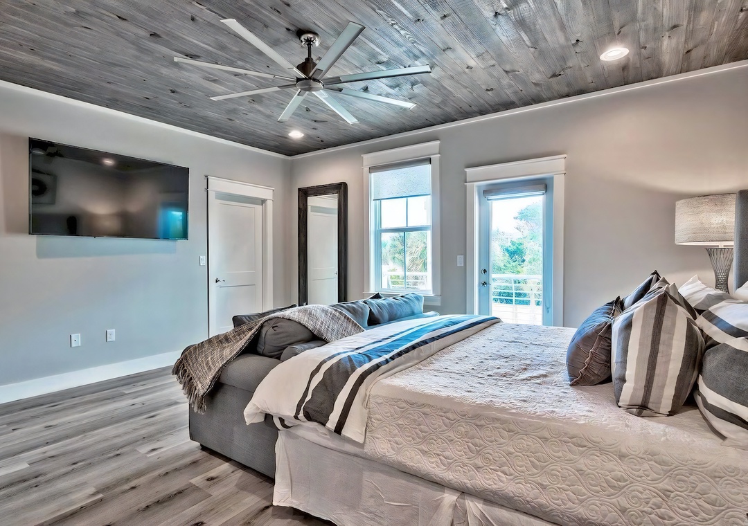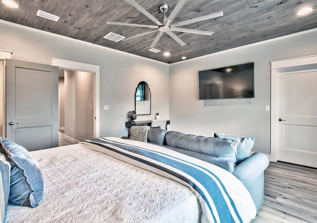Bedroom + Bathroom #6: This bedroom includes a king-sized bed, 2 nightstands, a bed bench, private closet, and a mounted flat-screen TV. Guests can enjoy direct access to the front balcony. There is a private bathroom attached with a single vanity and large walk-in shower.