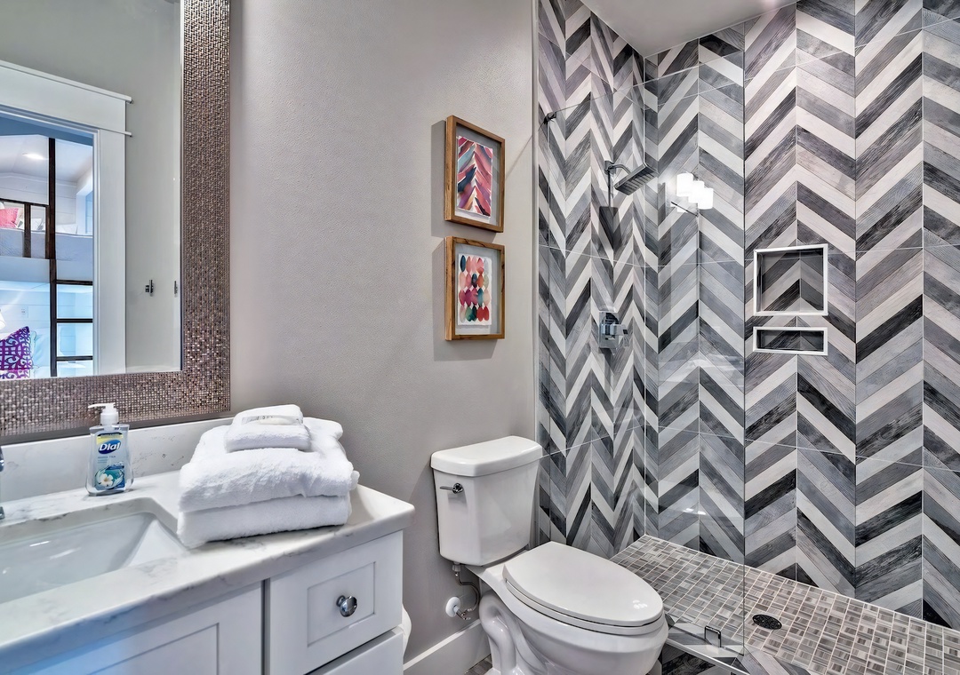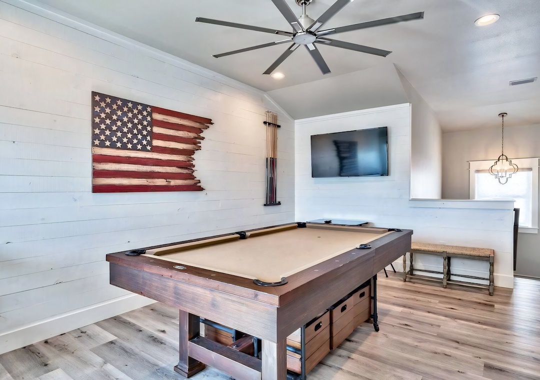 Each bedroom includes its own private bathroom, offering comfort and privacy for every guest. Upstairs, a tranquil master suite opens to a private balcony overlooking the pool, while custom bunk rooms provide a fun and cozy setup for kids. A large game room with a pool table, kitchenette, and classic arcade machine adds a perfect space for relaxing, hosting, or creating family memories.