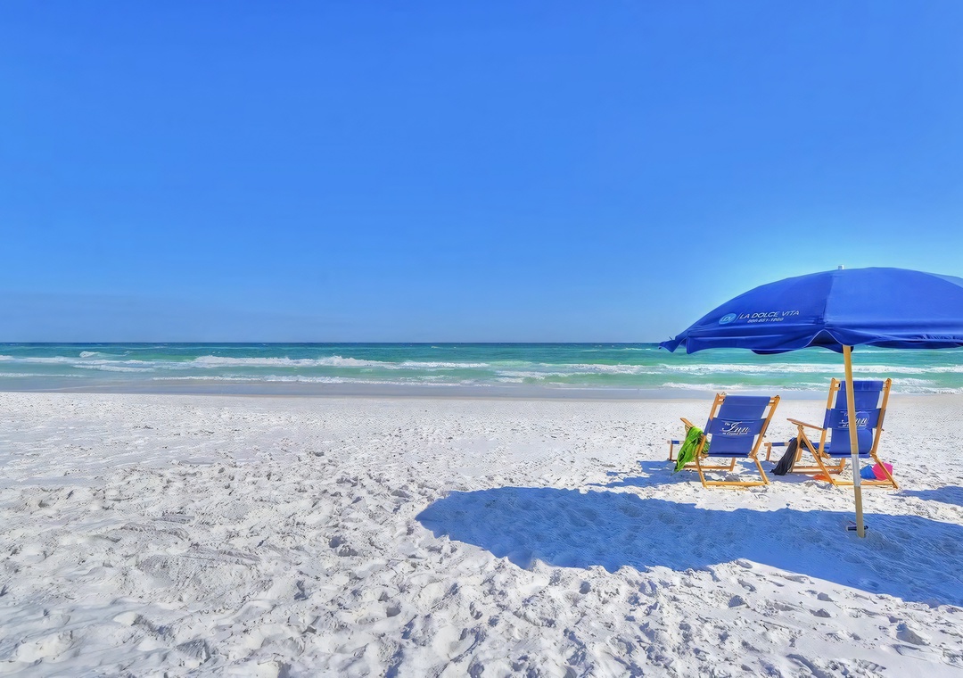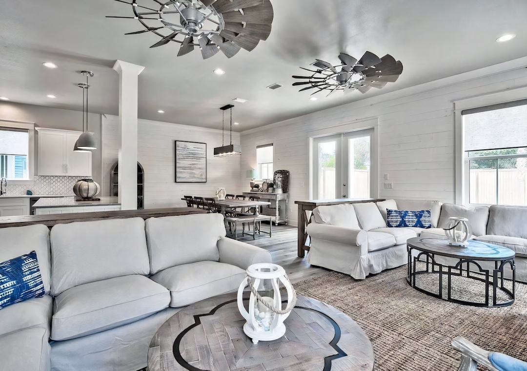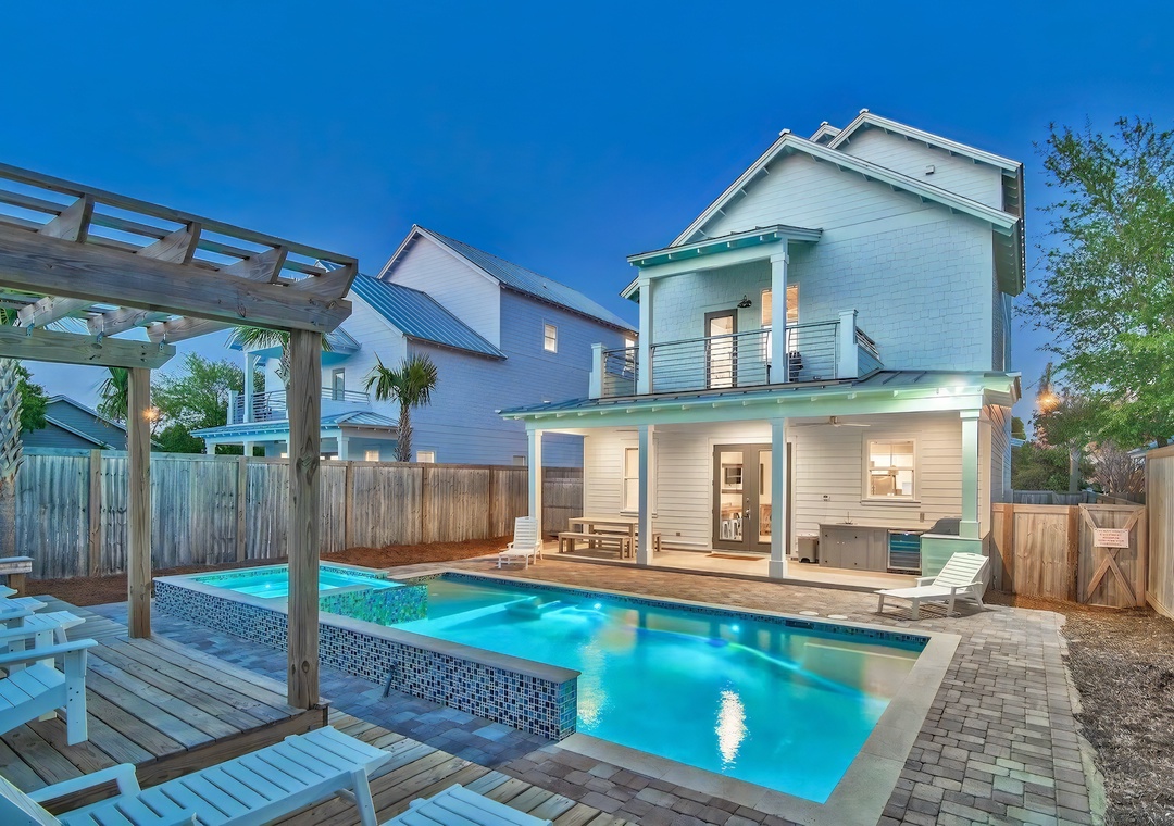 Outdoors, palm trees frame the private resort-style pool and spa, surrounded by comfortable lounge seating and a covered summer kitchen and dining area ideal for enjoying meals together. Guests can take a short stroll or enjoy a quick ride on the complimentary 6-passenger golf cart (LSV) to reach the sugar-white sands of Crystal Beach, along with nearby favorites like Camille’s, The Crab Trap, and Destin Commons. With its elegant design, resort-style amenities, and timeless coastal character, King’s Castle offers a Destin experience that feels both effortless and unforgettable.