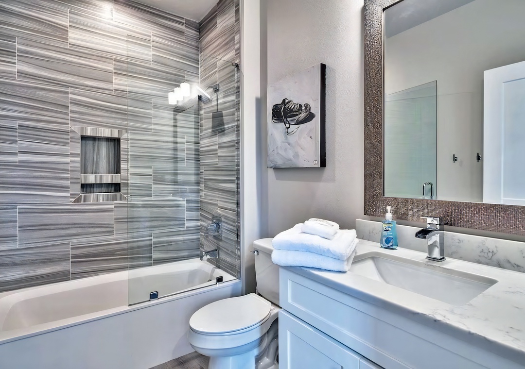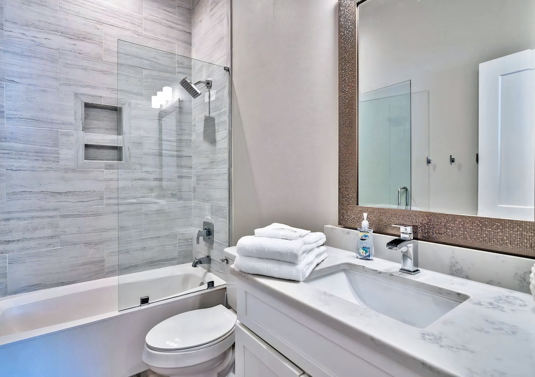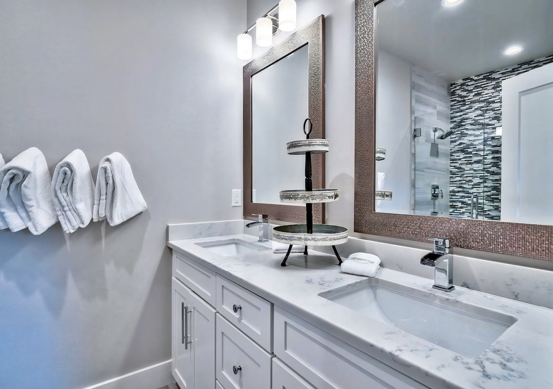 Bedroom + Bathroom #3: This bedroom includes a king-sized bed, 2 nightstands, a private closet, study desk, full-sized couch, and a mounted flat-screen TV. Guests can enjoy direct access to the back balcony. There is a private bathroom attached with a Jack-and-Jill vanity and large walk-in shower.
