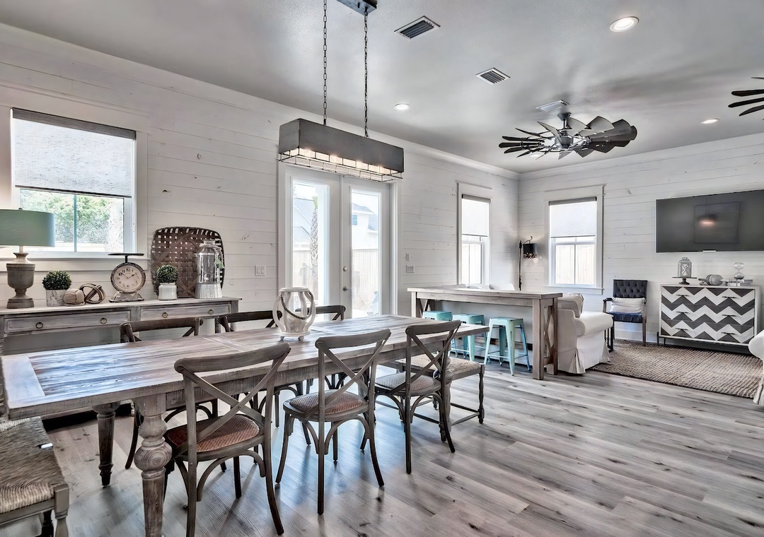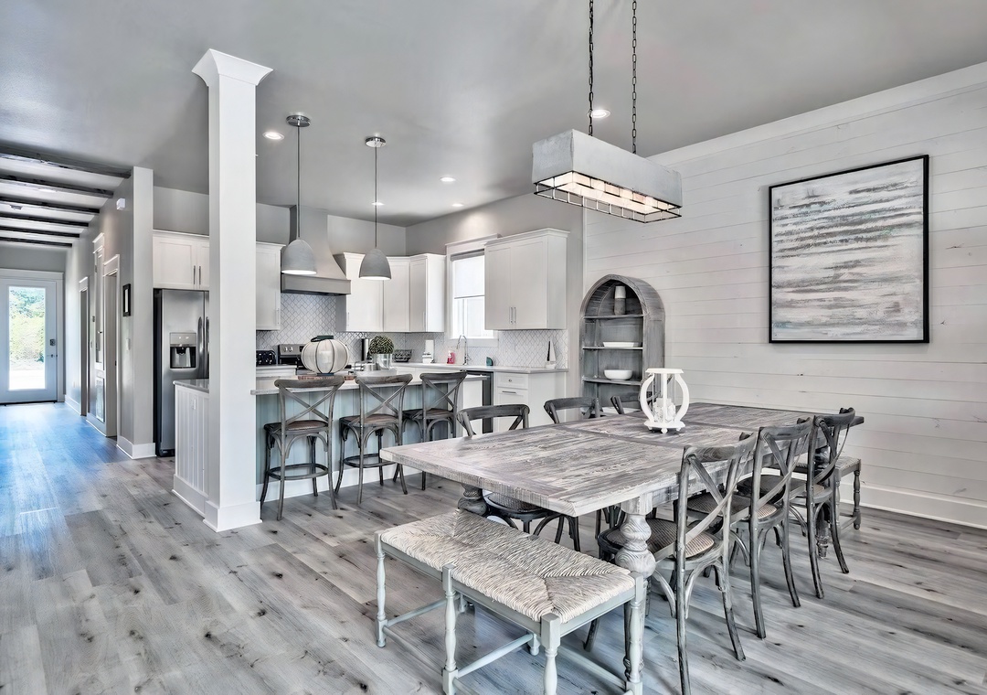 Dining Room: Next to the kitchen, the dining space centers around a wooden table with seating for 10, combining chairs and bench seating.