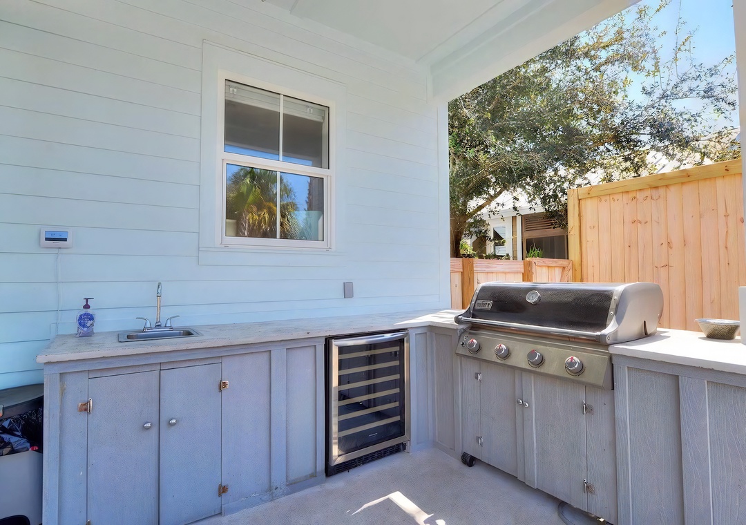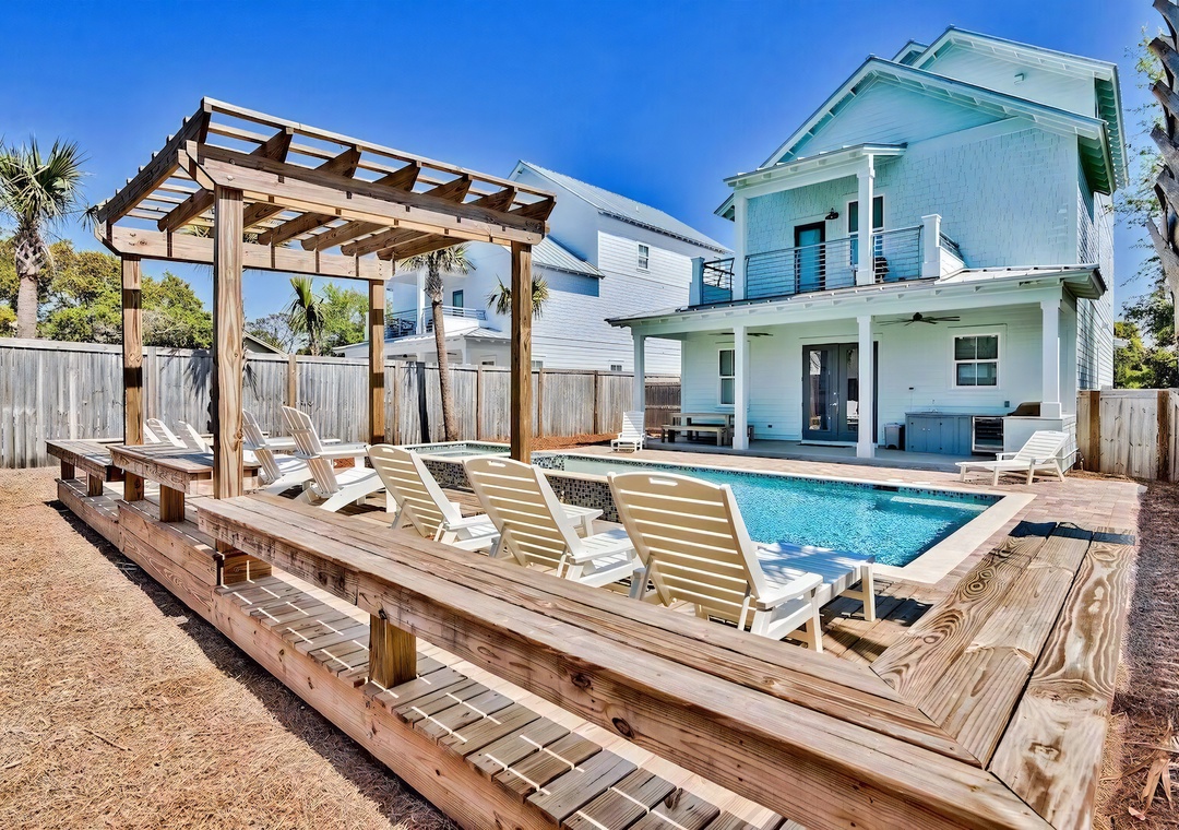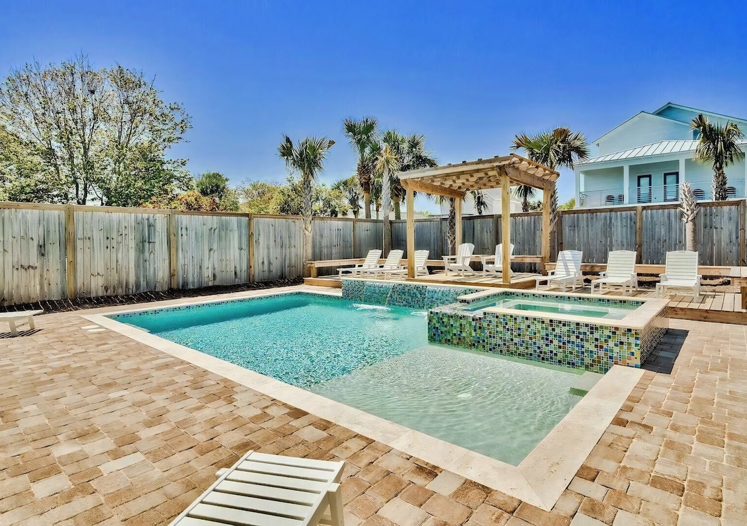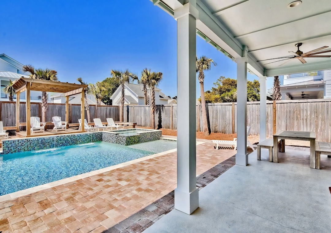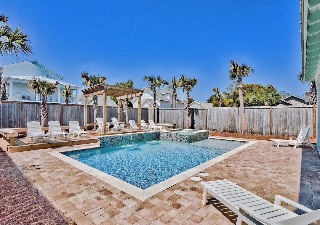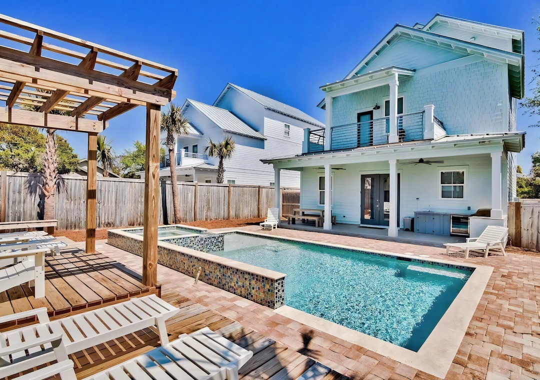 Backyard: The private backyard retreat features a resort-style pool and spa surrounded by palm trees and plenty of loungers for soaking up the sun. A wooden pergola adds a touch of coastal charm, while the covered patio includes a built-in grill, sink, and wine fridge for convenient outdoor cooking and entertaining. It’s the perfect space to relax, dine, and enjoy time by the pool.