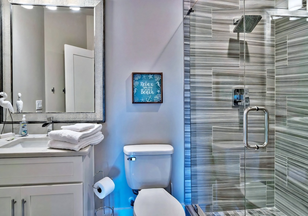 Bedroom + Bathroom #7: This bedroom includes 2 custom-built queen/queen bunk beds, plenty of open space for a pack-n-play, a private closet, and a mounted flat-screen TV. Guests can enjoy direct access to the front balcony. There is a private bathroom attached with a single vanity and large walk-in shower.