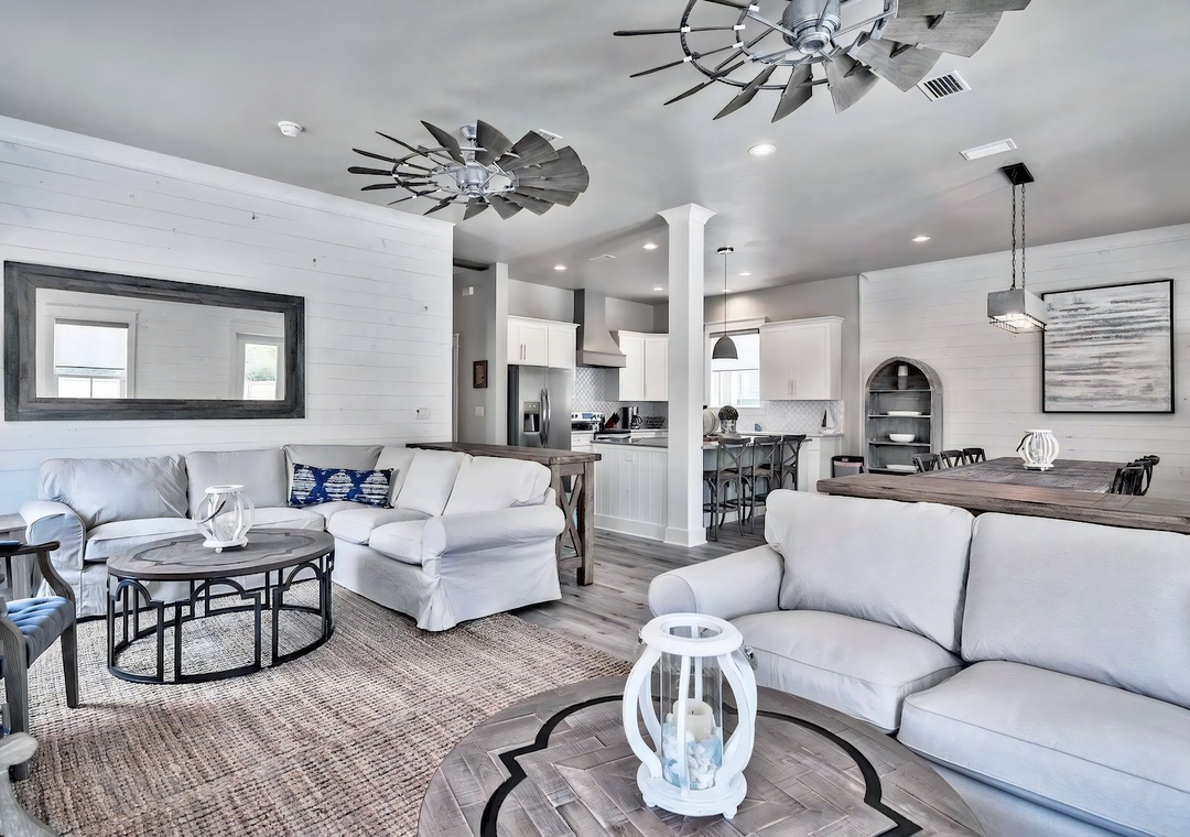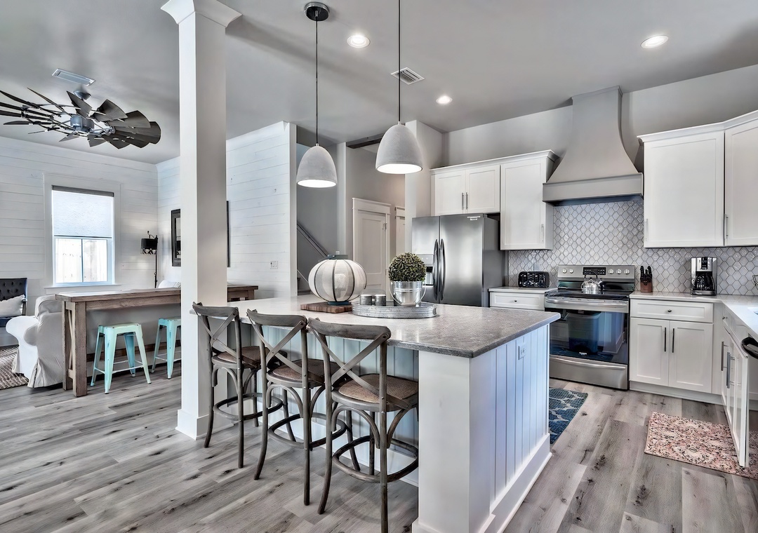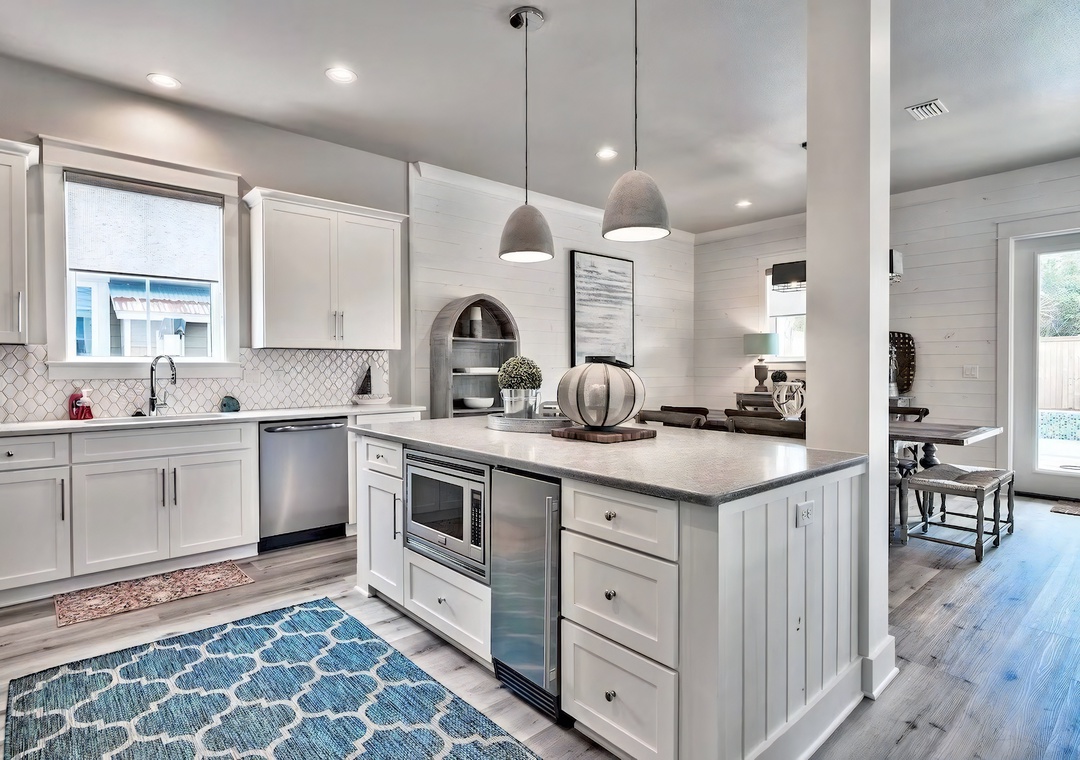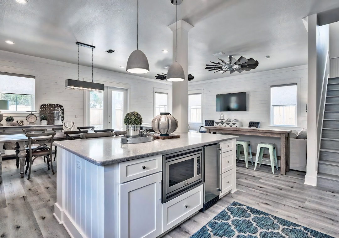 Kitchen: This modern kitchen is fully equipped for preparing meals with family and friends. It features sleek white cabinetry, polished quartz countertops, and stainless steel appliances. Amenities include a built-in ice maker, microwave, dishwasher, refrigerator, toaster, Keurig, coffeepot, crockpot, griddle, and blender. A large island with seating for 3 anchors the space, while 2 bar-height tables beside the living area provide additional seating for 6.