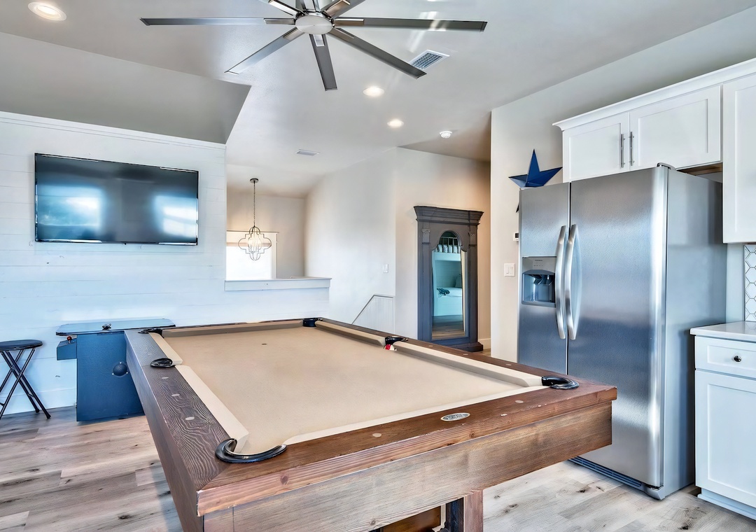 Game Room + Kitchenette: The 3rd floor game room offers the perfect space for fun and relaxation, featuring a pool table and a kitchenette with a full-sized fridge, built-in ice maker, sink, and dishwasher. A classic arcade machine and tall bistro table with 2 chairs complete the space, creating an inviting spot to snack, play, and unwind.