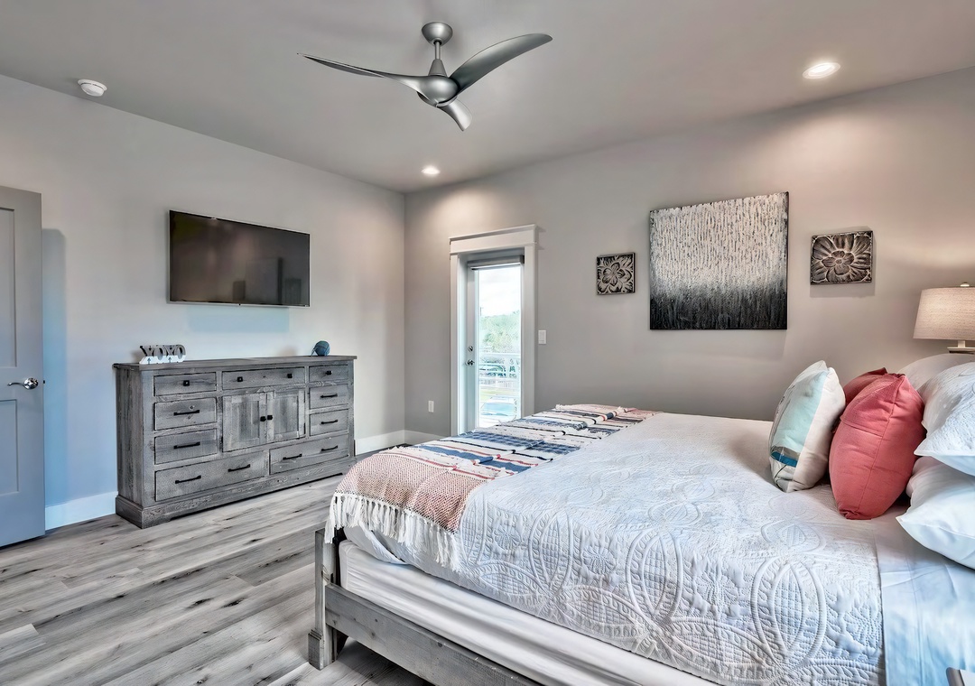 Bedroom + Bathroom #5: This bedroom includes a king-sized bed, 2 nightstands, a dresser, private closet, and a mounted flat-screen TV. Guests can enjoy direct access to the front balcony. There is a private bathroom attached with a single vanity and bathtub/shower combination.