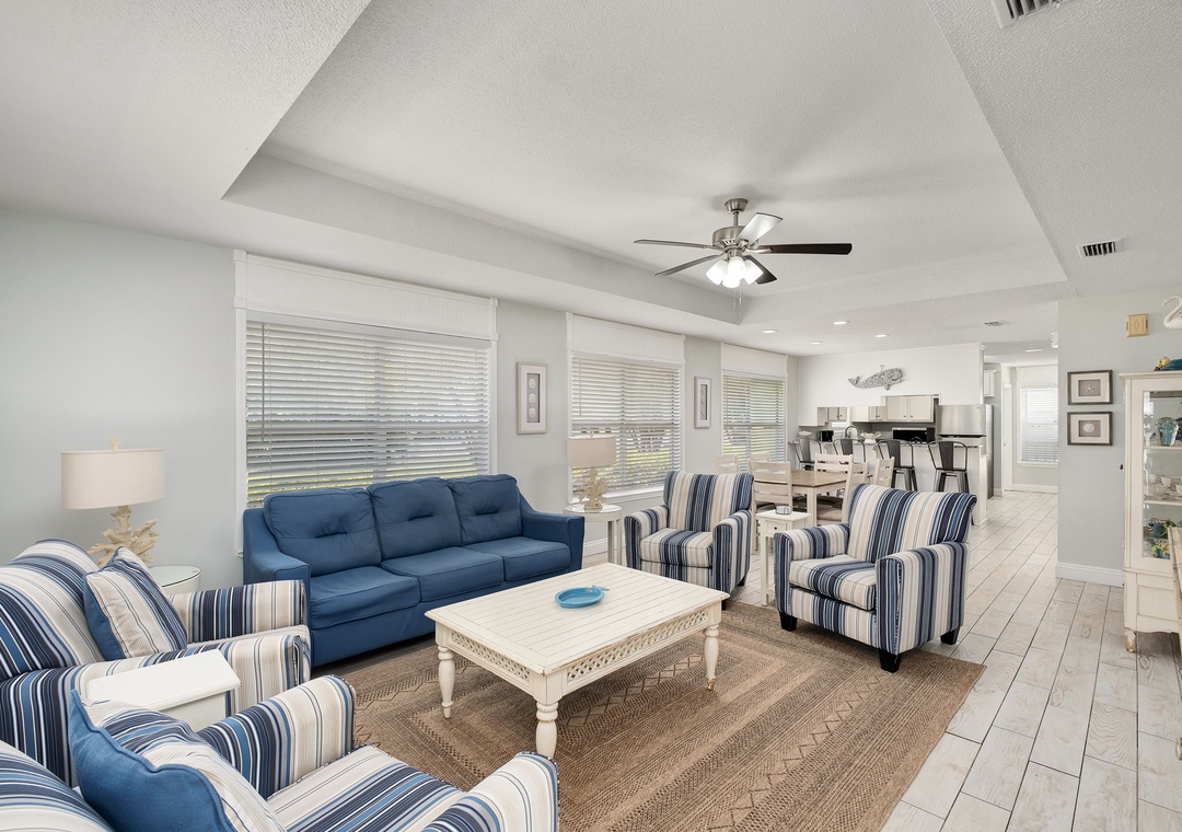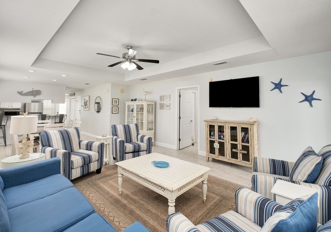 LIVING ROOM: This very spacious living room is right past the dining room. It has a full-sized sofa and four accent chairs. Watch your favorite shows on the large flat-screen TV!