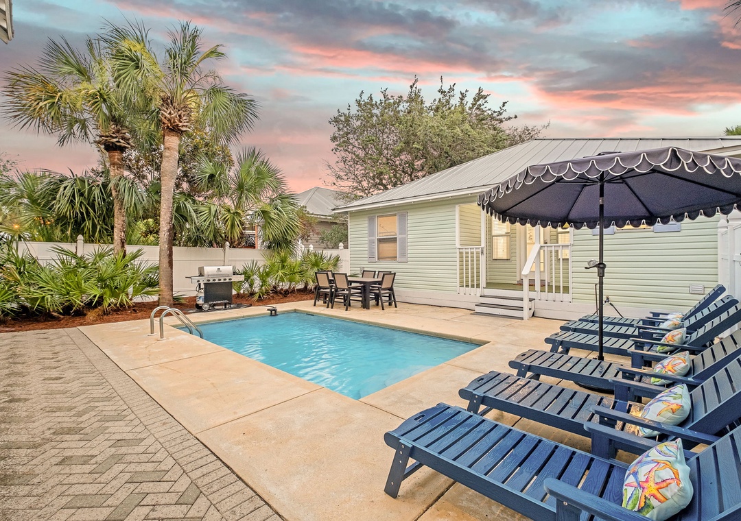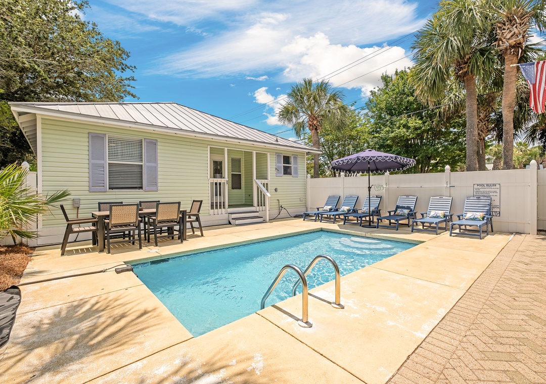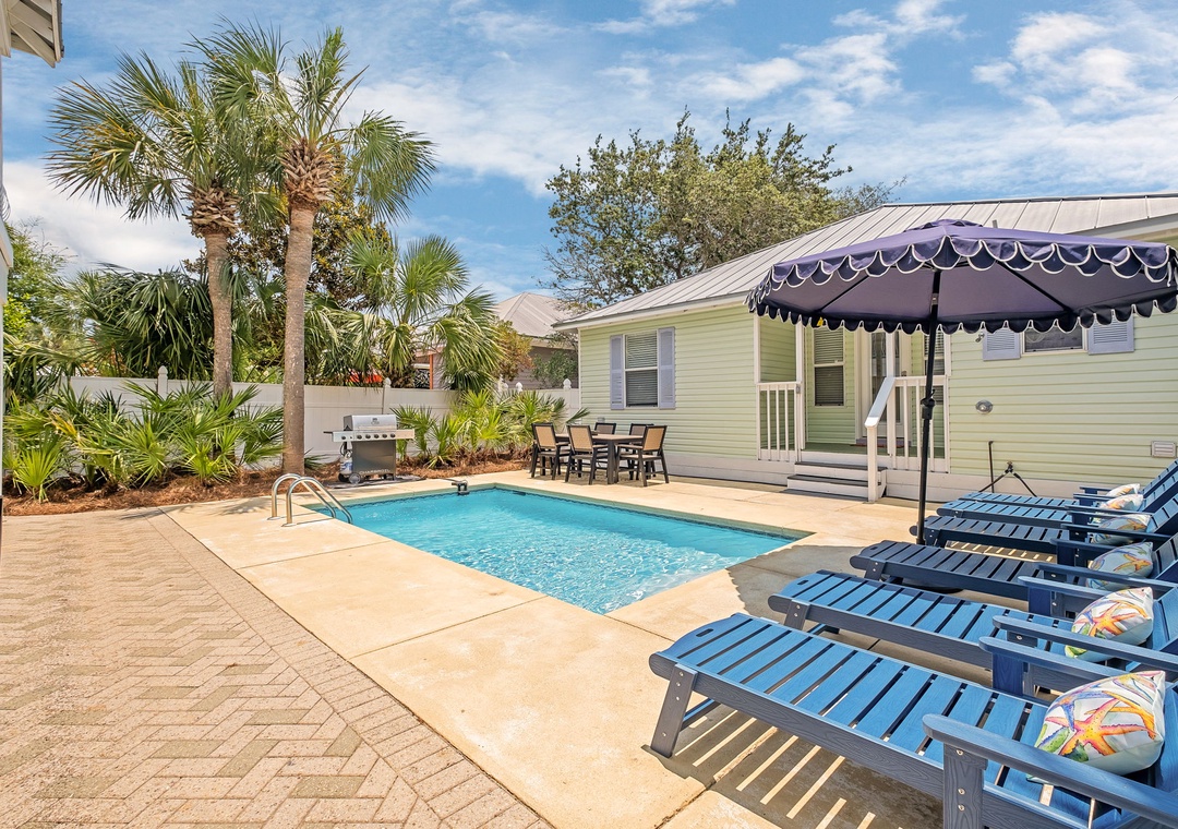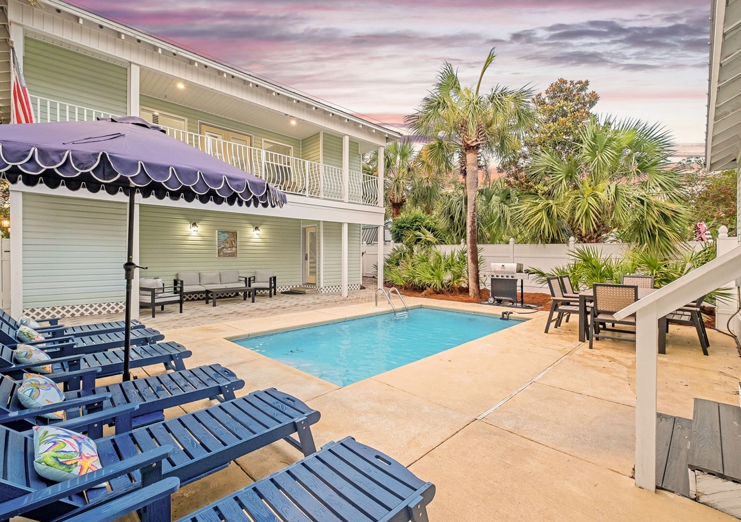 BACKYARD: Relax in your own private tropical oasis with a sparkling pool, a patio table for six, plenty of lounge chairs, and a grill for outdoor meals and entertainment.