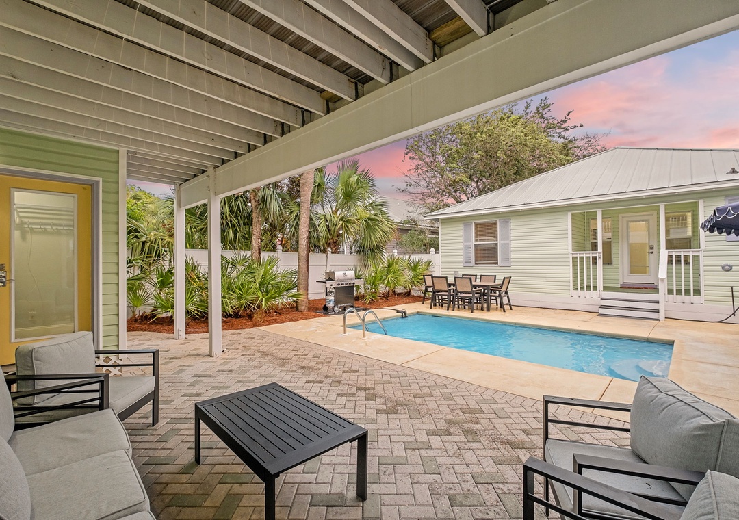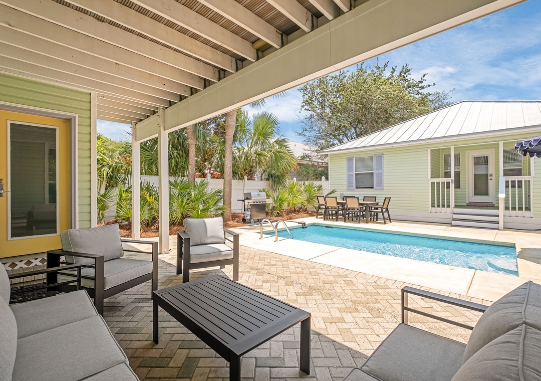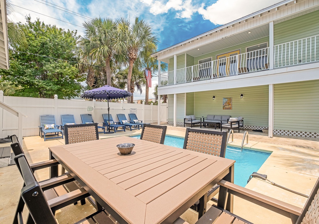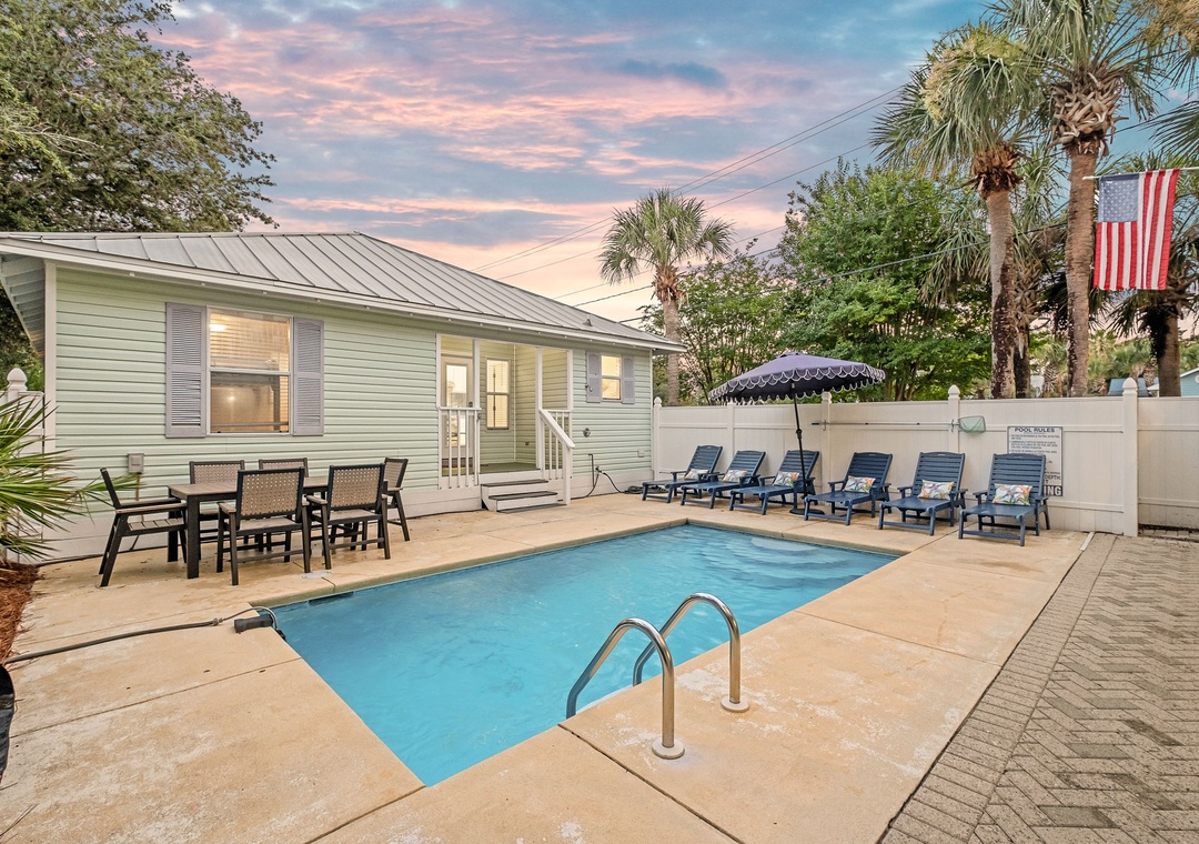 BACKYARD: Relax in your own private tropical oasis with a sparkling pool, a patio table for six, plenty of lounge chairs, and a grill for outdoor meals and entertainment.