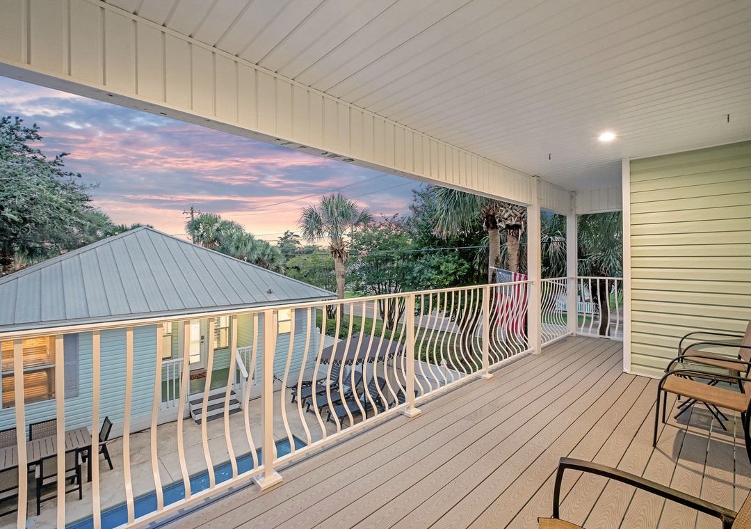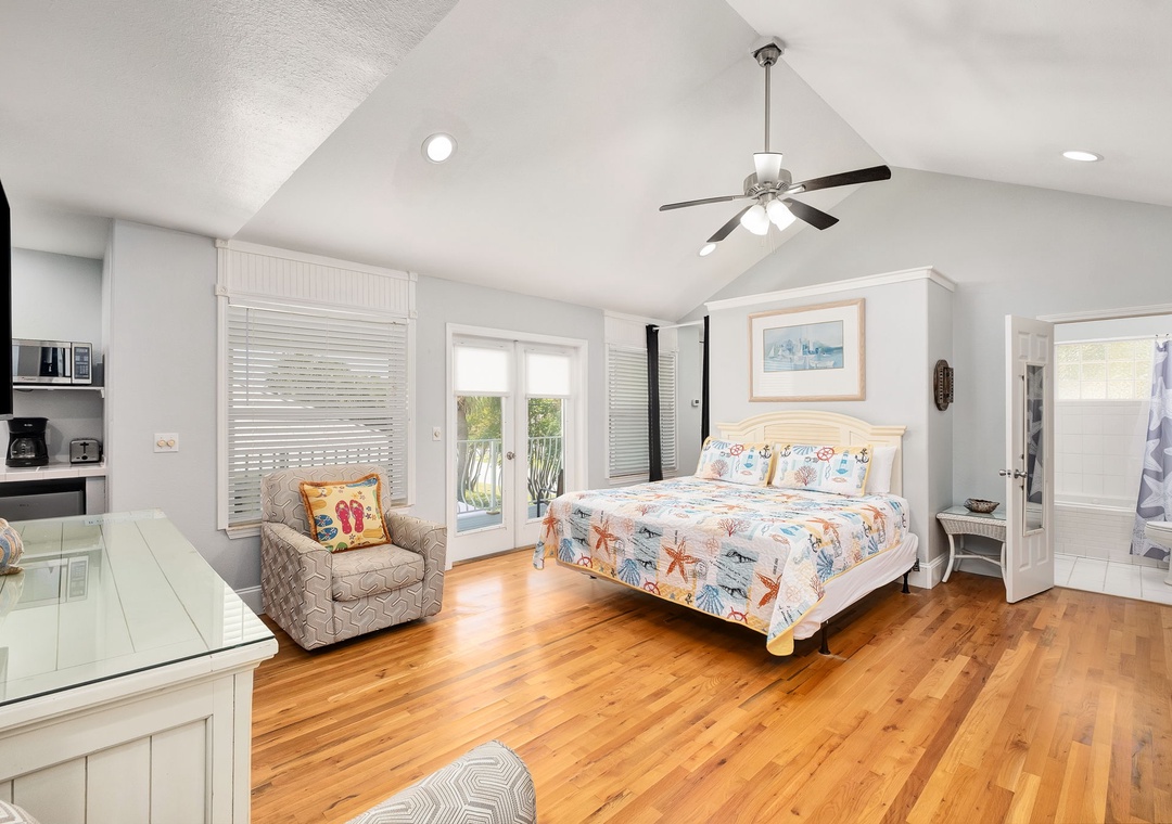 BEDROOM + BATHROOM #4: This bedroom encompasses the carriage house. It includes a king-sized bed and 2 twin beds, 2 dressers, a nightstand, an accent chair, and a mounted flat-screen TV. There is access to the large front balcony overlooking the pool. It has its own private bathroom with a tub/shower combination.