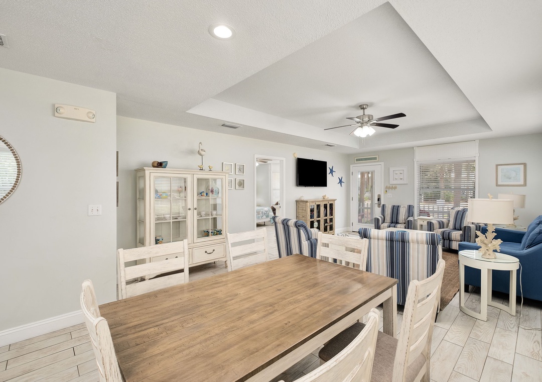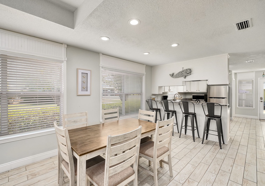 DINING ROOM: Located across from the kitchen and bar, this dining room has a beautiful wooden table that seats 6.