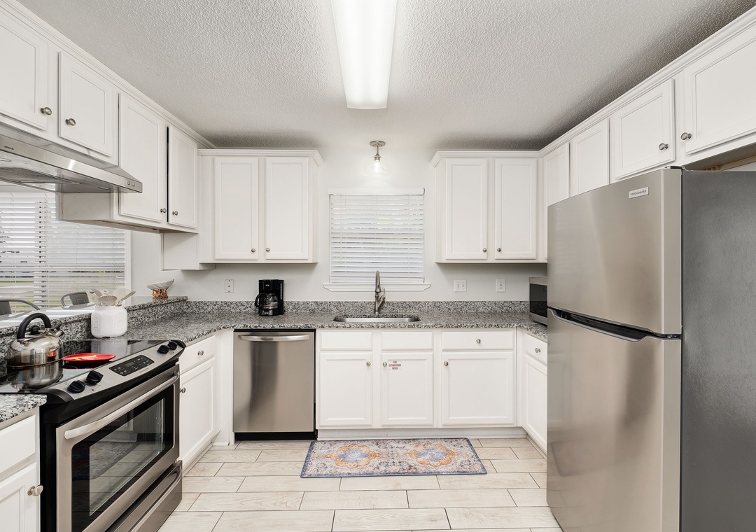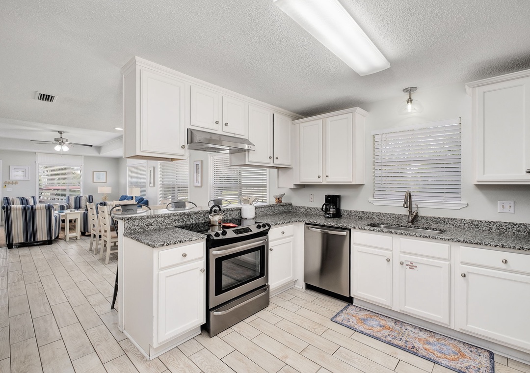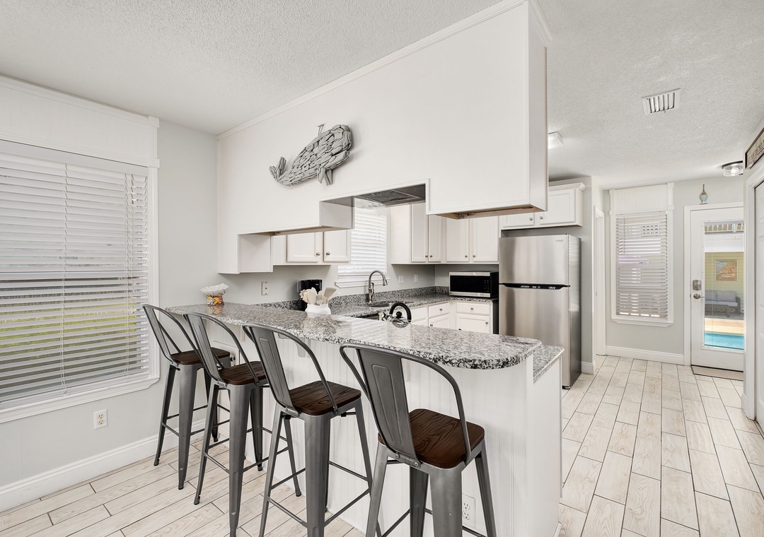 KITCHEN: This kitchen is fully stocked to make large family meals. It has beautiful, crisp white cabinetry and granite countertops. It includes a microwave, dishwasher, stove, one refrigerator, a toaster, Keurig, coffeepot, crockpot, griddle, and blender, as well as all the usual utensils and cookware. It also has an additional kitchen bar with seating for 4.
