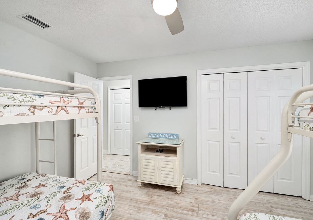 BEDROOM #3: This bedroom includes 2 twin/full bunk beds, a dresser, nightstand, and a mounted flat-screen TV. It shares Bathroom #2 with Bedroom #2.