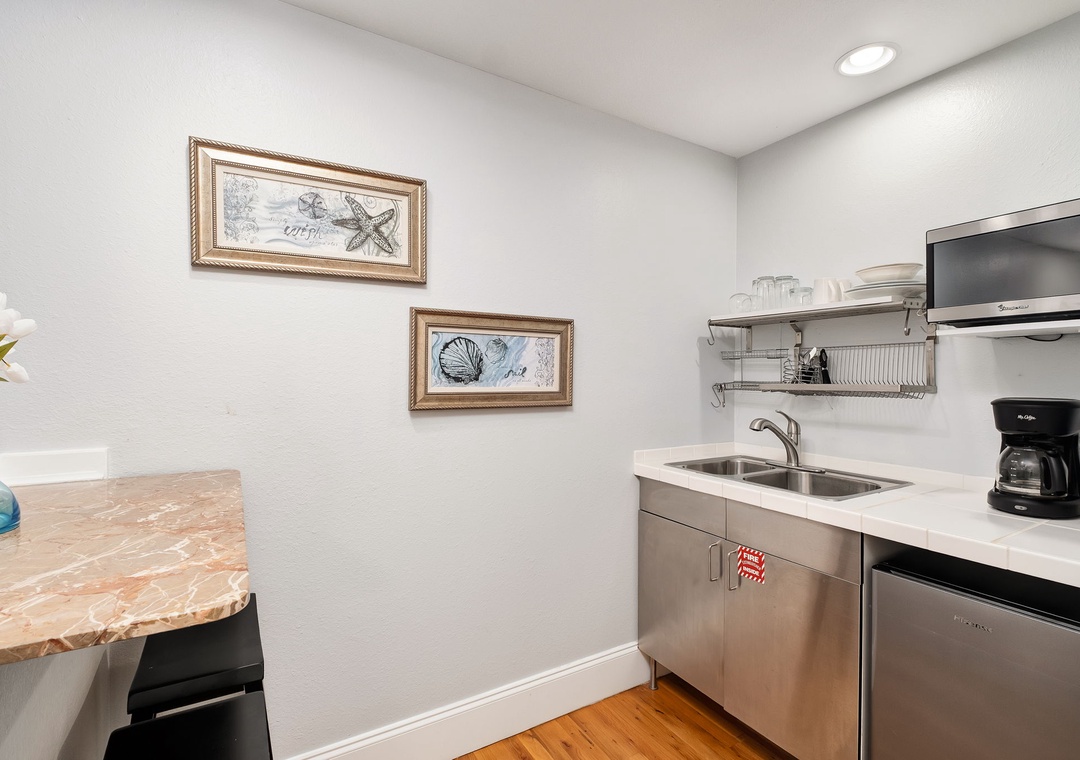KITCHENETTE: The kitchenette is attached to the carriage house’s bedroom. It includes a sink, microwave, mini-fridge, toaster, and coffeepot. There is also a counter-height bar with seating for 2.