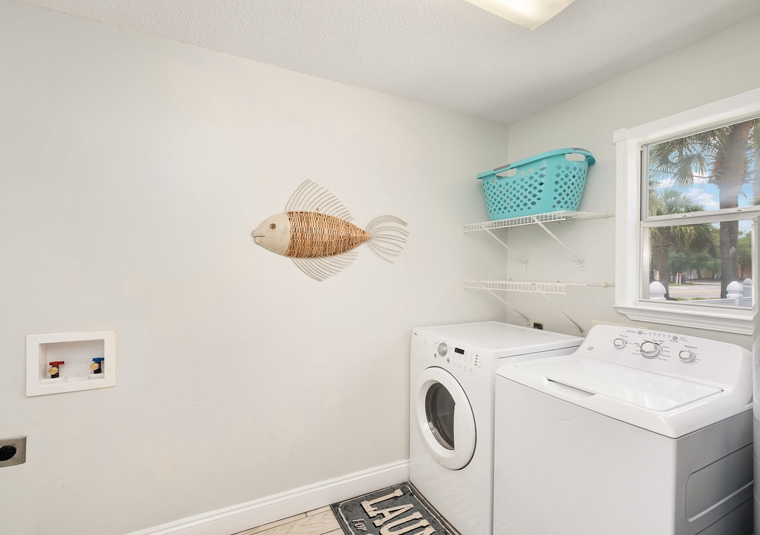 LAUNDRY: The laundry room is located behind the kitchen by the back door. It includes a full-sized washer and dryer.