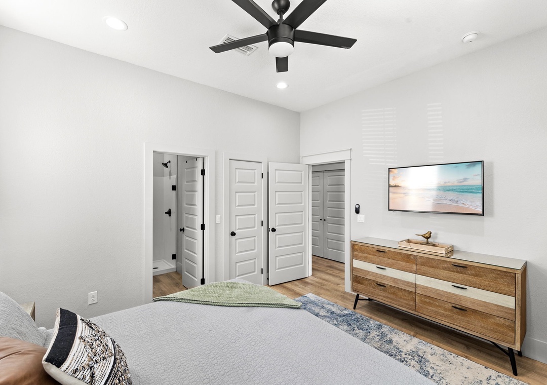 BEDROOM + BATHROOM #6: This room is across from the bunk room, in the back, left corner of the home. It includes a king-size bed, dresser, 2 nightstands, and a mounted flat-screen TV. It has a private bathroom with a glassed-in stand-up shower. It has extra floor space for an air mattress or pack-n-play. It also has access to the backyard balcony.