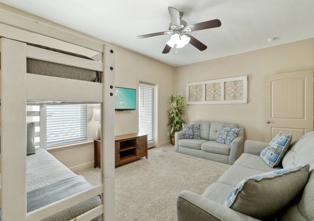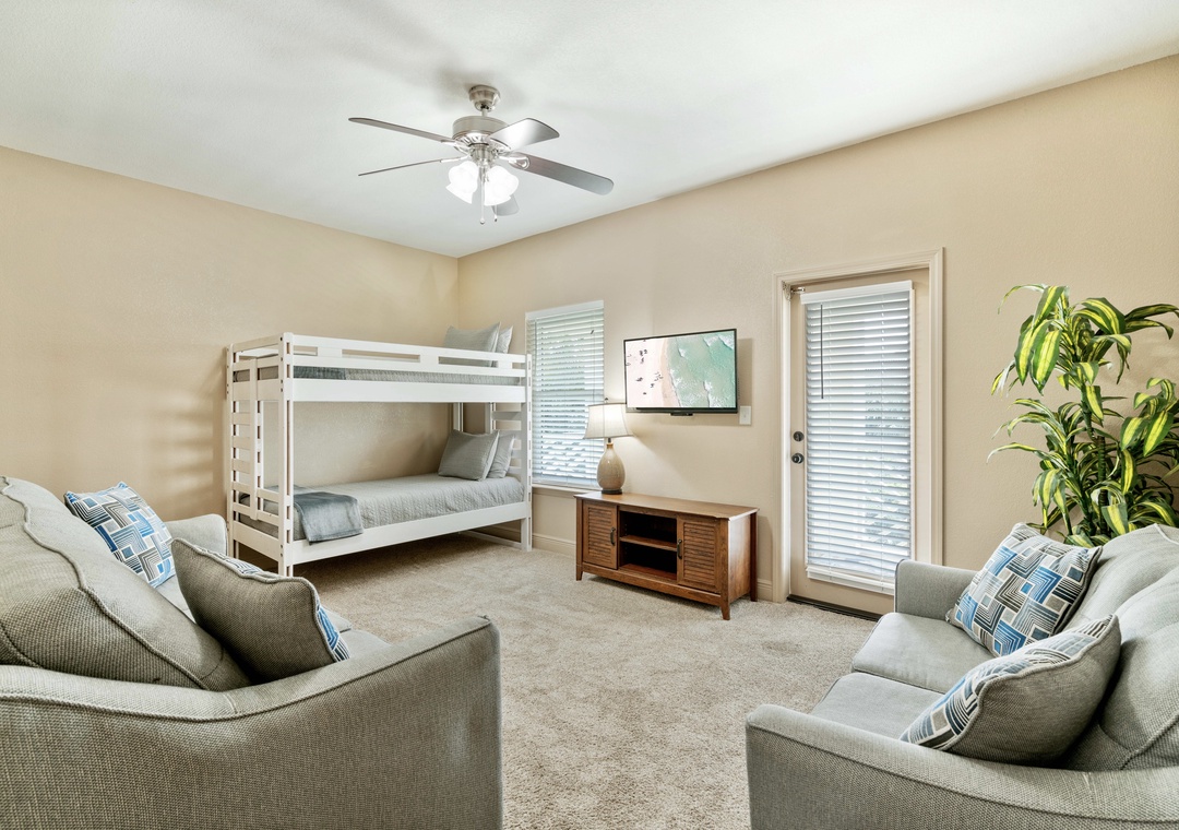 BEDROOM #4: This room is adjacent to Bedroom #3, in the back of the house. But rather than calling this a bedroom, it would be more appropriate to call it a hangout zone! It has a twin-over-twin bunk bed, 1 full-size couch, a flat-screen TV, and access to the same balcony as Bedroom #3 with lake views!