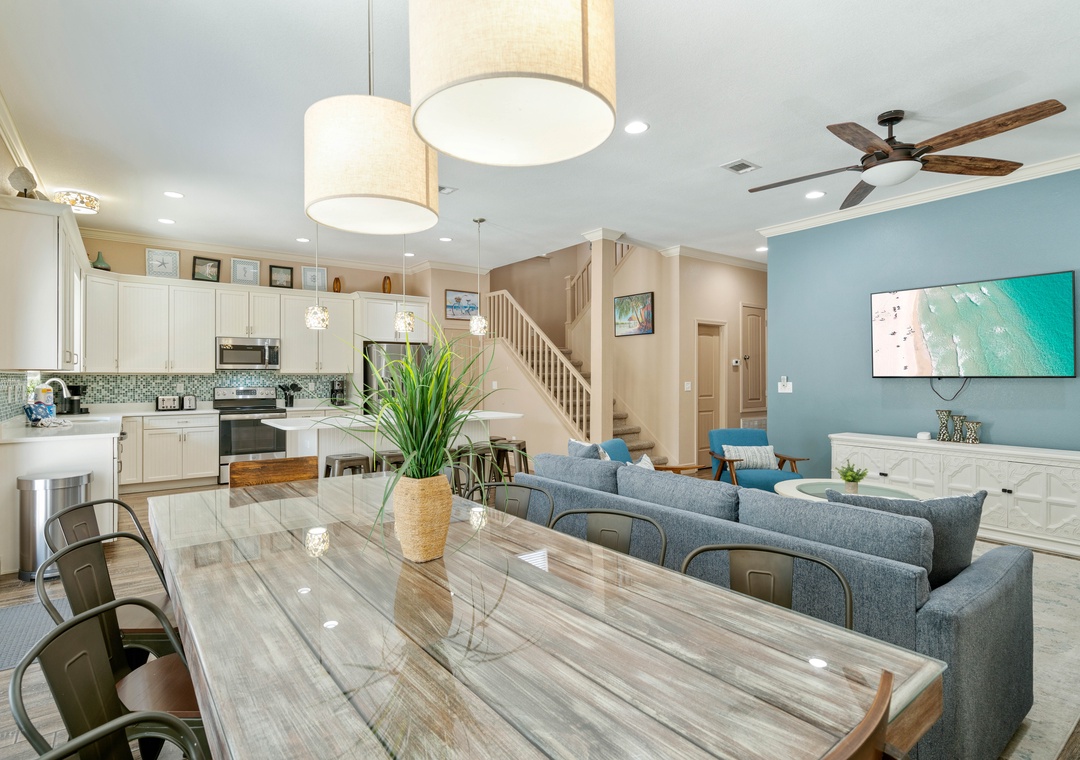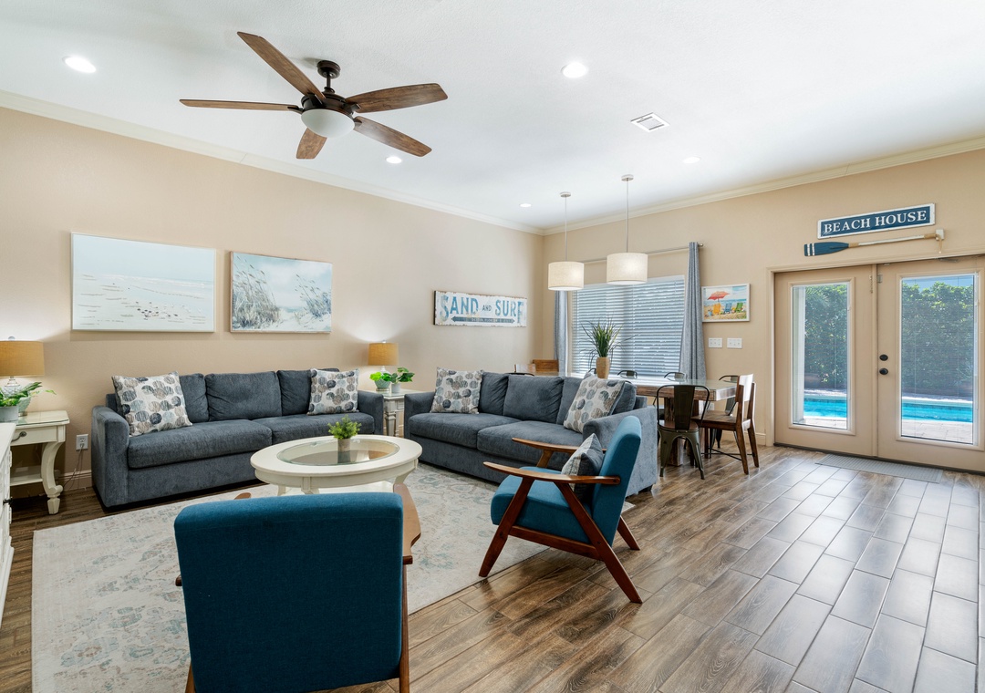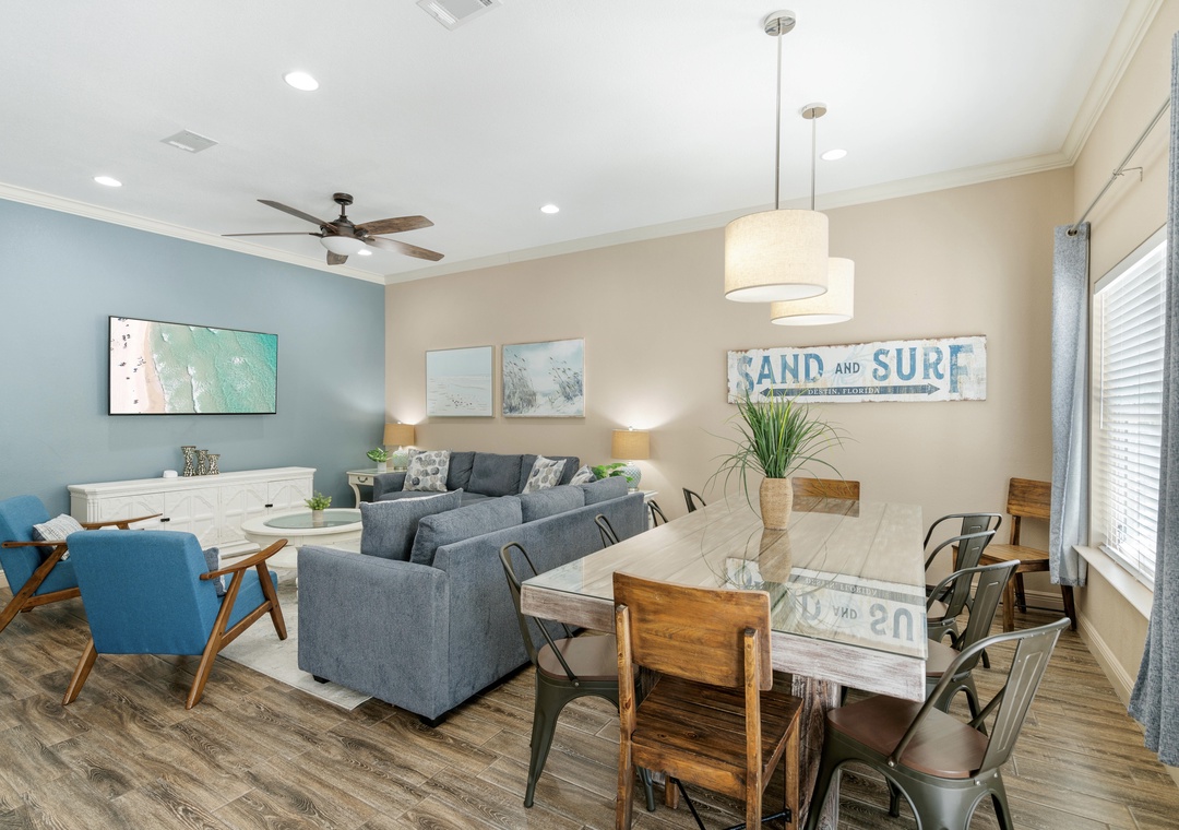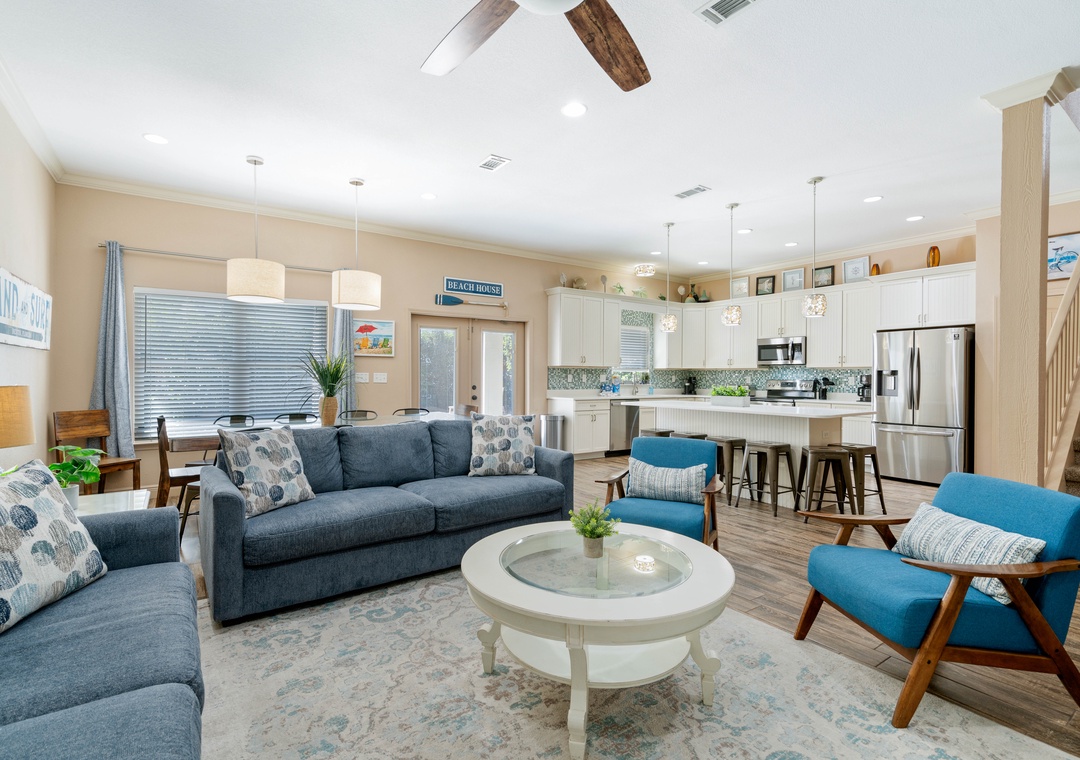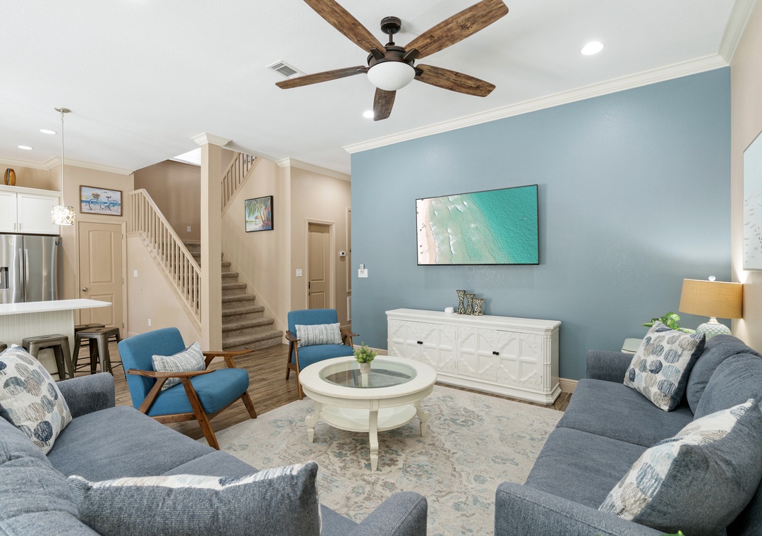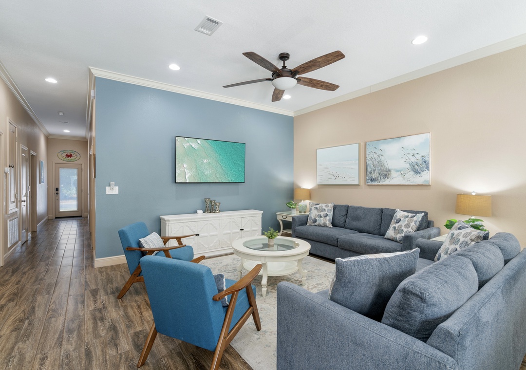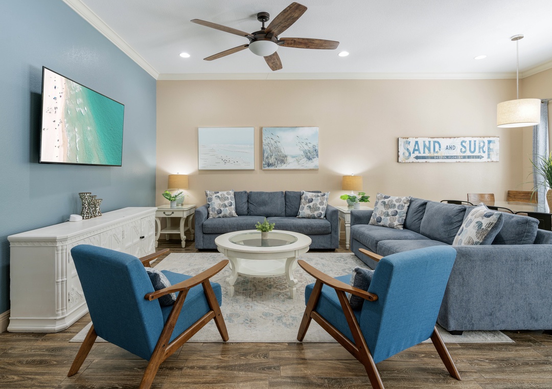 LIVING ROOM: This cozy living room is right next to the dining room and has 2 full-sized sofas and 2 accent chairs. Watch your favorite shows on the large 55-inch, 4K flat-screen TV.