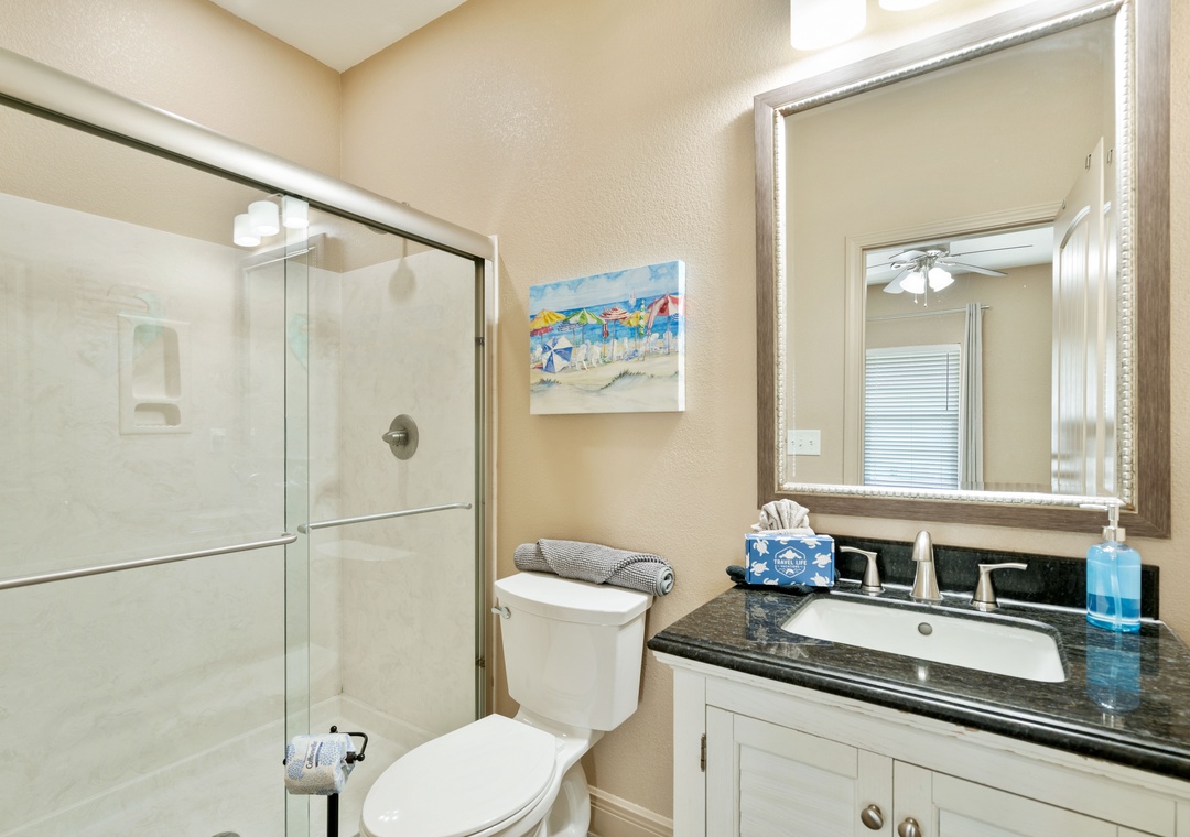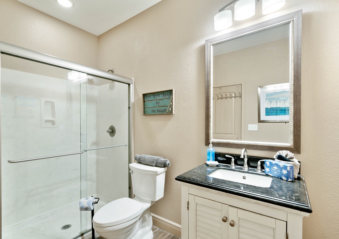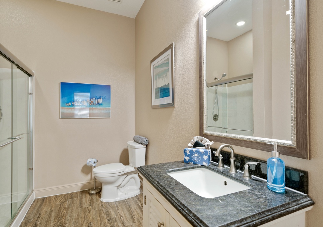 BEDROOM + BATHROOM #2: Located on the first floor (across from Bedroom #1). This bedroom has a king-sized bed, dresser, 2 nightstands, and a flat-screen TV. It has its own spacious, private bathroom with a stand-up shower.